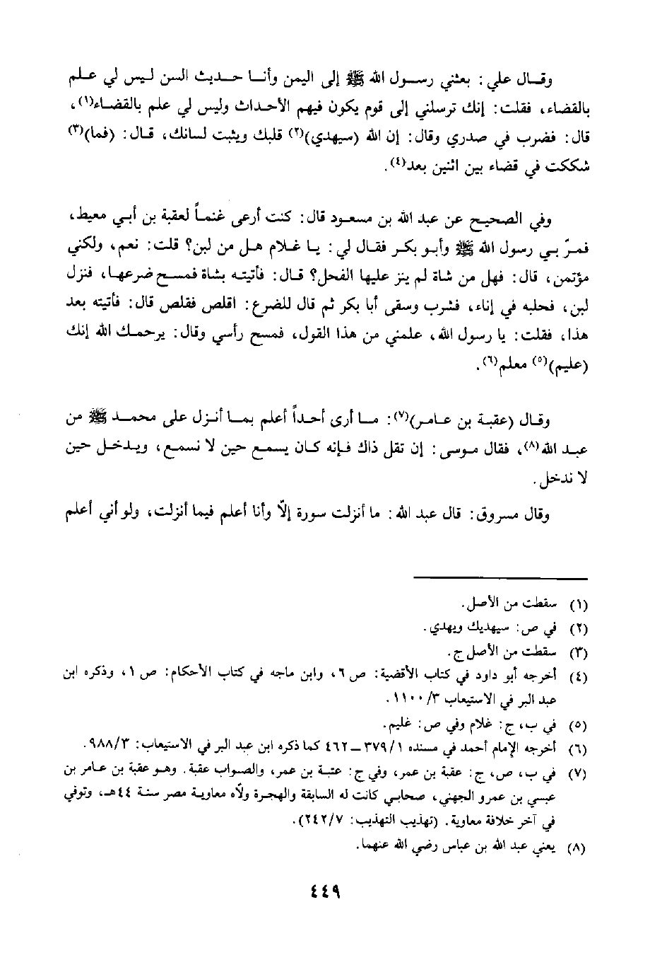وَفِي الصَّحِيحِ عَنْ عَبْدِ اللَّهِ بْنِ مَسْعُودٍ، قَالَ: كُنْتُ أَرْعَى غَنَمًا لِعُقْبَةَ بْنِ أَبِي مُعَيْطٍ، فَمَرَّ بِي رَسُولُ اللَّهِ صَلَّى اللَّهُ عَلَيْهِ وَسَلَّمَ وَأَبُو بَكْرٍ، فَقَالَ لِي: يَا غُلَامُ هَلْ مِنْ لَبَنٍ؟، قُلْتُ: نَعَمْ، وَلَكِنِّي مُؤْتَمَنٌ، قَالَ: فَهَلْ مِنْ شَاةٍ لَمْ يَنْزُو عَلَيْهَا الْفَحْلُ؟، قَالَ فَأَتَيْتُهُ بِشَّاةٍ فَمَسَحَ ضَرْعَهَا فَنَزَلَ لَبَنٌ فَحَلَبَهُ فِي إِنَاءٍ، فَشَرِبَ وَسَقَى أَبَا بَكْرٍ، ثُمَّ قَالَ لِلضَّرْعِ: اقْلِصْ فَقَلَصَ، قَالَ: فَأَتَيْتُهُ بَعْدَ هَذَا، فَقُلْتُ: يَا رَسُولَ اللَّهِ عَلِّمْنِي مِنْ هَذَا الْقَوْلِ، فَمَسَحَ رَأْسِي، وَقَالَ: يَرْحَمُكَ اللَّهُ، إِنَّكَ عَلِيمٌ مُعَلَّمٌ.