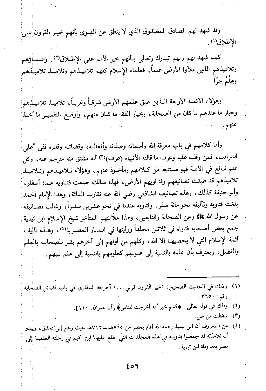 وَأَمَّا كَلَامُهُمْ فِي بَابِ مَعْرِفَةِ اللَّهِ وَأَسْمَائِهِ وَصِفَاتِهِ وَأَفْعَالِهِ وَقَضَائِهِ وَقَدَرِهِ فَفِي أَعْلَى الْمَرَاتِبِ، فَمَنْ وَقَفَ عَلَيْهِ وَعَرَفَ مَا قَالَتْهُ الْأَنْبِيَاءُ عَرَفَ أَنَّهُ مُشْتَقٌّ مِنْهُ مُتَرْجَمٌ عَنْهُ، وَكُلُّ عَلَمٍ نَافِعٍ فِي الْأُمَّةِ فَهُوَ مُسْتَنْبَطٌ مِنْ كَلَامِهِمْ وَمَأْخُوذٌ عَنْهُمْ، وَهَؤُلَاءِ تَلَامِيذُهُمْ وَتَلَامِيذُ تَلَامِيذِهِمْ قَدْ طَبَقَتْ تَصَانِيفِهِمْ وَفَتَاوِيهِمُ الْأَرْضَ. فَهَذَا مَالِكٌ جُمِعَتْ فَتَاوِيهِ عِدَّةَ أَسْفَارٍ، وَأَبُو حَنِيفَةَ كَذَلِكَ، وَهَذِهِ تَصَانِيفُ الشَّافِعِيِّ رَضِيَ اللَّهُ عَنْهُ تُقَارِبُ الْمِائَةَ، وَهَذَا الْإِمَامُ أَحْمَدُ بَلَغَتْ فَتَاوِيهِ وَتَآلِيفُهُ نَحْوَ مِائَةِ سِفْرٍ، وَفَتَاوِيهِ عِنْدَنَا فِي نَحْوِ عِشْرِينَ سِفْرًا، وَغَالِبُ تَصَانِيفِهِ عَنْ رَسُولِ اللَّهِ صَلَّى اللَّهُ عَلَيْهِ وَسَلَّمَ وَعَنِ الصَّحَابَةِ وَالتَّابِعِينَ، وَهَذَا عَلَّامَتُهُمُ الْمُتَأَخِّرُ شَيْخُ الْإِسْلَامِ ابْنُ تَيْمِيَّةَ جَمَعَ بَعْضُ أَصْحَابِهِ فَتَاوَاهُ فِي ثَلَاثِينَ مُجَلَّدًا وَرَأَيْتُهَا فِي الدِّيَارِ الْمِصْرِيَّةِ، وَهَذِهِ تَآلِيفُ أَئِمَّةِ الْإِسْلَامِ الَّتِي لَا يُحْصِيهَا إِلَّا اللَّهُ، كُلُّهُمْ مِنْ أَوَّلِهِمْ إِلَى آخِرِهِمْ يُقِرُّ لِلصَّحَابَةِ بِالْعِلْمِ وَالْفَضْلِ، وَيَعْتَرِفُ بِأَنَّ عِلْمَهُ بِالنِّسْبَةِ إِلَى عُلُومِهِمْ كَعُلُومِهِمْ بِالنِّسْبَةِ إِلَى عِلْمِ نَبِيِّهِمْ.