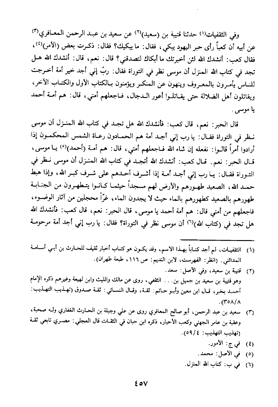 وَفِي الثَّقَفِيَّاتِ حَدَّثَنَا قُتَيْبَةُ بْنُ سَعِيدٍ، عَنْ سَعِيدِ بْنِ عَبْدِ الرَّحْمَنِ الْمُعَافِرَيِّ، عَنْ أَبِيهِ: ... أَنَّ كَعْبًا رَأَى حَبْرَ الْيَهُودِ يَبْكِي، فَقَالَ لَهُ: مَا يُبْكِيكَ؟ قَالَ: ذَكَرْتُ بَعْضَ الْأَمْرِ، فَقَالَ كَعْبٌ: أَنْشُدُكَ اللَّهَ لَئِنْ أَخْبَرْتُكَ مَا أَبْكَاكَ لَتَصْدُقَنِي؟ قَالَ: نَعَمْ، قَالَ أَنْشُدُكَ اللَّهَ: هَلْ تَجِدُّ فِي كِتَابِ اللَّهِ الْمُنَزَّلِ أَنَّ مُوسَى نَظَرَ فِي التَّوْرَاةِ فَقَالَ: رَبِّ إِنِّي أَجِدُ خَيْرَ أُمَّةٍ أُخْرِجَتْ لِلنَّاسِ يَأْمُرُونَ بِالْمَعْرُوفِ وَيَنْهَوْنَ عَنِ الْمُنْكَرِ، وَيُؤْمِنُونَ بِالْكِتَابِ الْأَوَّلِ وَالْكِتَابِ الْآخِرِ، وَيُقَاتِلُونَ أَهْلَ الضَّلَالَةِ حَتَّى يُقَاتِلُونَ أَعْوَرَ الدَّجَّالِ، فَاجْعَلْهُمْ أُمَّتِي، قَالَ: هُمْ أُمَّةُ أَحْمَدَ يَا مُوسَى؟ قَالَ الْحَبْرُ: نَعَمْ.