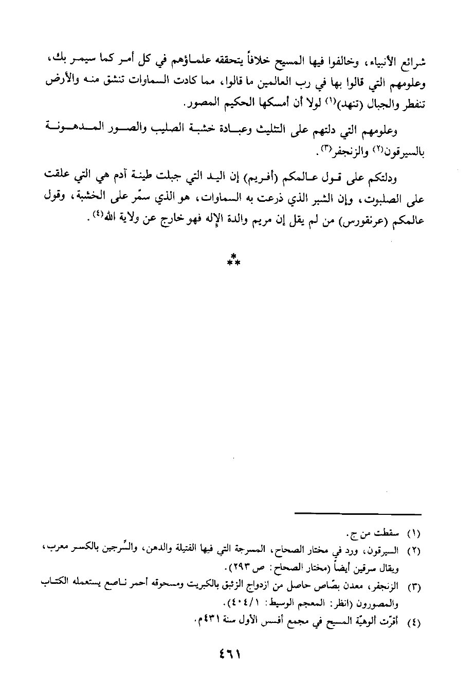 وَعُلُومُهُمُ الَّتِي دَلَّتْهُمْ عَلَى التَّثْلِيثِ، وَعِبَادَةِ خَشَبَةِ الصَّلِيبِ وَالصُّوَرِ الْمَدْهُونَةِ بِالسِّيرْقُونِ وَالزُّنْجُفْرِ.