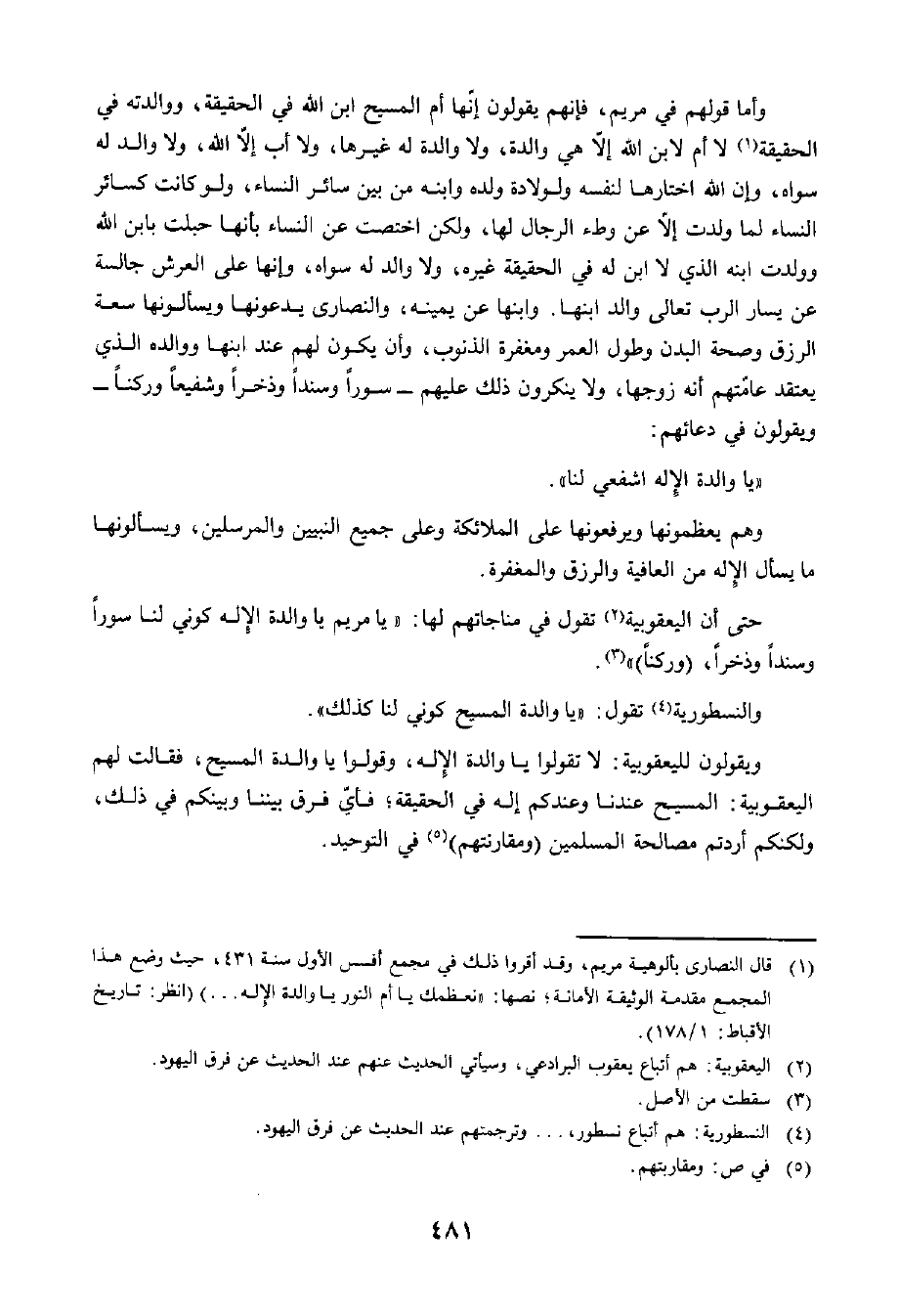 وَأَمَّا قَوْلُهُمْ فِي مَرْيَمَ، فَإِنَّهُمْ يَقُولُونَ: إِنَّهَا أُمٌّ الْمَسِيحِ ابْنِ اللَّهِ فِي الْحَقِيقَةِ، وَوَالِدَتُهُ فِي الْحَقِيقَةِ، لَا أُمَّ لِابْنِ اللَّهِ إِلَّا هِيَ وَالِدَةٌ، وَلَا وَالِدَةَ لَهُ غَيْرُهَا، وَلَا أَبَ إِلَّا اللَّهُ، وَلَا وَالِدَ لَهُ سِوَاهُ، وَإِنَّ اللَّهَ اخْتَارَهَا لِنَفْسِهِ وَلِوِلَادَةِ وَلَدِهِ وَابْنِهِ مِنْ بَيْنِ سَائِرِ النِّسَاءِ، وَلَوْ كَانَتْ كَسَائِرِ النِّسَاءِ لَمَا وَلَدَتْ إِلَّا عَنْ وَطْءِ الرِّجَالِ لَهَا، وَلَكِنِ اخْتُصَّتْ عَنِ النِّسَاءِ بِأَنَّهَا حَبِلَتْ بِابْنِ اللَّهِ، وَوَلَدَتِ ابْنَهُ الَّذِي لَا ابْنَ لَهُ فِي الْحَقِيقَةِ غَيْرُهُ، وَلَا وَالِدَ لَهُ سِوَاهُ، وَإِنَّهَا عَلَى الْعَرْشِ جَالِسَةٌ عَنْ يَسَارِ الرَّبِّ تَعَالَى وَالِدِ ابْنِهَا، وَابْنُهَا عَنْ يَمِينِهِ. وَالنَّصَارَى يَدْعُونَهَا وَيَسْأَلُونَهَا سَعَةَ الرِّزْقِ، وَصِحَّةَ الْبَدَنِ، وَطُولَ الْعُمُرِ، وَمَغْفِرَةَ الذُّنُوبِ، وَأَنْ يَكُونَ لَهُمْ عِنْدَ ابْنِهَا وَوَالِدِهِ - الَّذِي يَعْتَقِدُ عَامَّتُهُمْ أَنَّهُ زَوْجُهَا، وَلَا يُنْكِرُونَ ذَلِكَ عَلَيْهِمْ - سُورًا وَسَنَدًا وَذُخْرًا وَشَفِيعًا وَرُكْنًا، وَيَقُولُونَ فِي دُعَائِهِمْ: