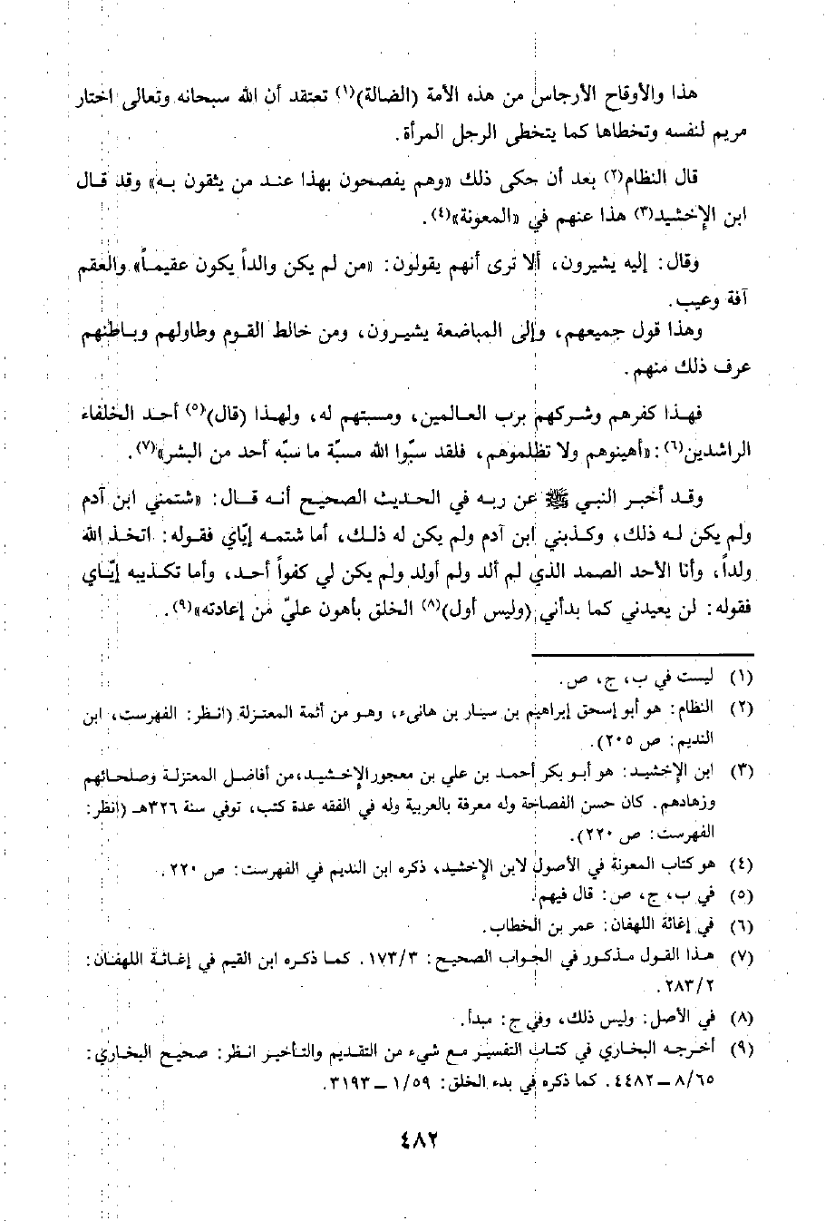 وَقَدْ أَخْبَرَ النَّبِيُّ - صَلَّى اللَّهُ عَلَيْهِ وَسَلَّمَ - عَنْ رَبِّهِ فِي الْحَدِيثِ الصَّحِيحِ أَنَّهُ قَالَ: شَتَمَنِي ابْنُ آدَمَ وَلَمْ يَكُنْ لَهُ ذَلِكَ، وَكَذَّبَنِي ابْنُ آدَمَ وَلَمْ يَكُنْ لَهُ ذَلِكَ، أَمَّا شَتْمُهُ إِيَّايَ فَقَوْلُهُ: اتَّخَذَ اللَّهُ وَلَدًا، وَأَنَا الْأَحَدُ الصَّمَدُ الَّذِي لَمْ أَلِدْ وَلَمْ أُوَلَدْ وَلَمْ يَكُنْ لِي كُفُوًا أَحَدٌ، وَأَمَّا تَكْذِيبُهُ إِيَّايَ فَقَوْلُهُ: لَنْ يُعِيدَنِي كَمَا بَدَأَنِي، وَلَيْسَ أَوَّلُ الْخَلْقِ بِأَهْوَنَ عَلَيَّ مِنْ إِعَادَتِهِ.