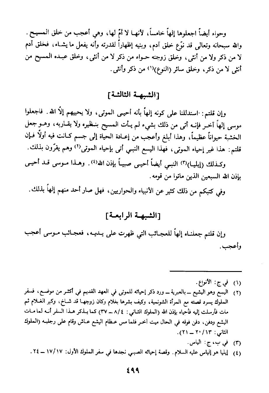 وَإِنْ قُلْتُمْ: اسْتَدْلَلْنَا عَلَى كَوْنِهِ إِلَهًا بِأَنَّهُ أَحْيَا الْمَوْتَى، وَلَا يُحْيِيهِمْ إِلَّا اللَّهُ، فَاجْعَلُوا مُوسَى إِلَهًا آخَرَ، فَإِنَّهُ أَتَى مِنْ ذَلِكَ بِشَيْءٍ لَمْ يَأْتِ الْمَسِيحُ بِنَظِيرِهِ وَلَا مَا يُقَارِبُهُ، وَهُوَ جَعْلُ الْخَشَبَةِ حَيَوَانًا عَظِيمًا، وَهَذَا أَبْلَغُ مِنْ إِعَادَةِ الْحَيَاةِ إِلَى جِسْمٍ كَانَتْ فِيهِ أَوَّلًا، فَإِنْ قُلْتُمْ: هَذَا غَيْرُ إِحْيَاءِ الْمَوْتَى، فَهَذَا الْيَسَعُ النَّبِيُّ أَتَى بِإِحْيَاءِ الْمَوْتَى، وَهُمْ يُقِرُّونَ بِذَلِكَ.