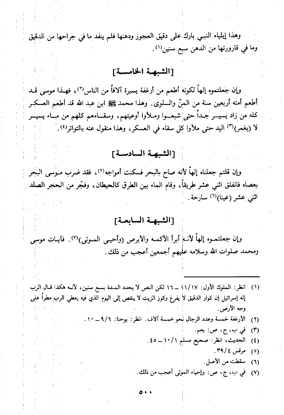 وَإِنْ جَعَلْتُمُوهُ إِلَهًا لِكَوْنِهِ أَطْعَمَ مِنْ أَرْغِفَةٍ يَسِيرَةٍ آلَافًا مِنَ النَّاسِ، فَهَذَا مُوسَى قَدْ أَطْعَمَ أُمَّتَهُ أَرْبَعِينَ سَنَةً مِنَ الْمَنِّ وَالسَّلْوَى! وَهَذَا مُحَمَّدٌ صَلَّى اللَّهُ عَلَيْهِ وَسَلَّمَ ابْنُ عَبْدِ اللَّهِ قَدْ أَطْعَمَ الْعَسْكَرَ كُلَّهُ مِنْ زَادٍ يَسِيرُ جِدًّا حَتَّى شَبِعُوا وَمَلَئُوا أَوْعِيَتَهُمْ، وَسَقَاهُمْ كُلَّهُمْ مِنْ مَاءٍ يَسِيرٍ لَا يَغْمُرُ الْيَدَ حَتَّى مَلَئُوا كُلَّ سِقَاءٍ فِي الْعَسْكَرِ، وَهَذَا مَنْقُولٌ عَنْهُ بِالتَّوَاتُرِ.