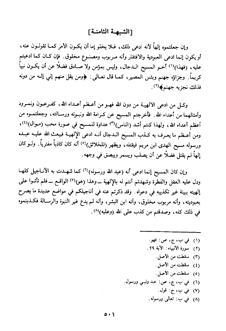 وَإِنْ كَانَ الْمَسِيحُ إِنَّمَا ادَّعَى أَنَّهُ عَبْدُ اللَّهِ وَرَسُولُهُ كَمَا شَهِدَتْ بِهِ الْأَنَاجِيلُ كُلُّهَا وَدَلَّ عَلَيْهِ الْعَقْلُ وَالْفِطْرَةُ وَشَهِدْتُمْ أَنْتُمْ لَهُ بِالْإِلَهِيَّةِ - وَهَذَا هُوَ الْوَاقِعُ - فَلَمْ تَأْتُوا عَلَى إِلَهِيَّتِهِ بِبَيِّنَةٍ غَيْرِ تَكْذِيبِهِ فِي دَعْوَاهُ، وَقَدْ ذَكَرْتُمْ عَنْهُ فِي أَنَاجِيلِكُمْ فِي مَوَاضِعَ عَدِيدَةٍ مَا يُصَرِّحُ بِعُبُودِيَّتِهِ، وَأَنَّهُ مَرْبُوبٌ مَخْلُوقٌ، وَأَنَّهُ ابْنُ الْبَشَرِ، وَأَنَّهُ لَمْ يَدَّعِ غَيْرَ النُّبُوَّةِ وَالرِّسَالَةِ، فَكَذَّبْتُمُوهُ فِي ذَلِكَ كُلِّهِ، وَصَدَّقْتُمْ مَنْ كَذَبَ عَلَى اللَّهِ وَعَلَيْهِ!