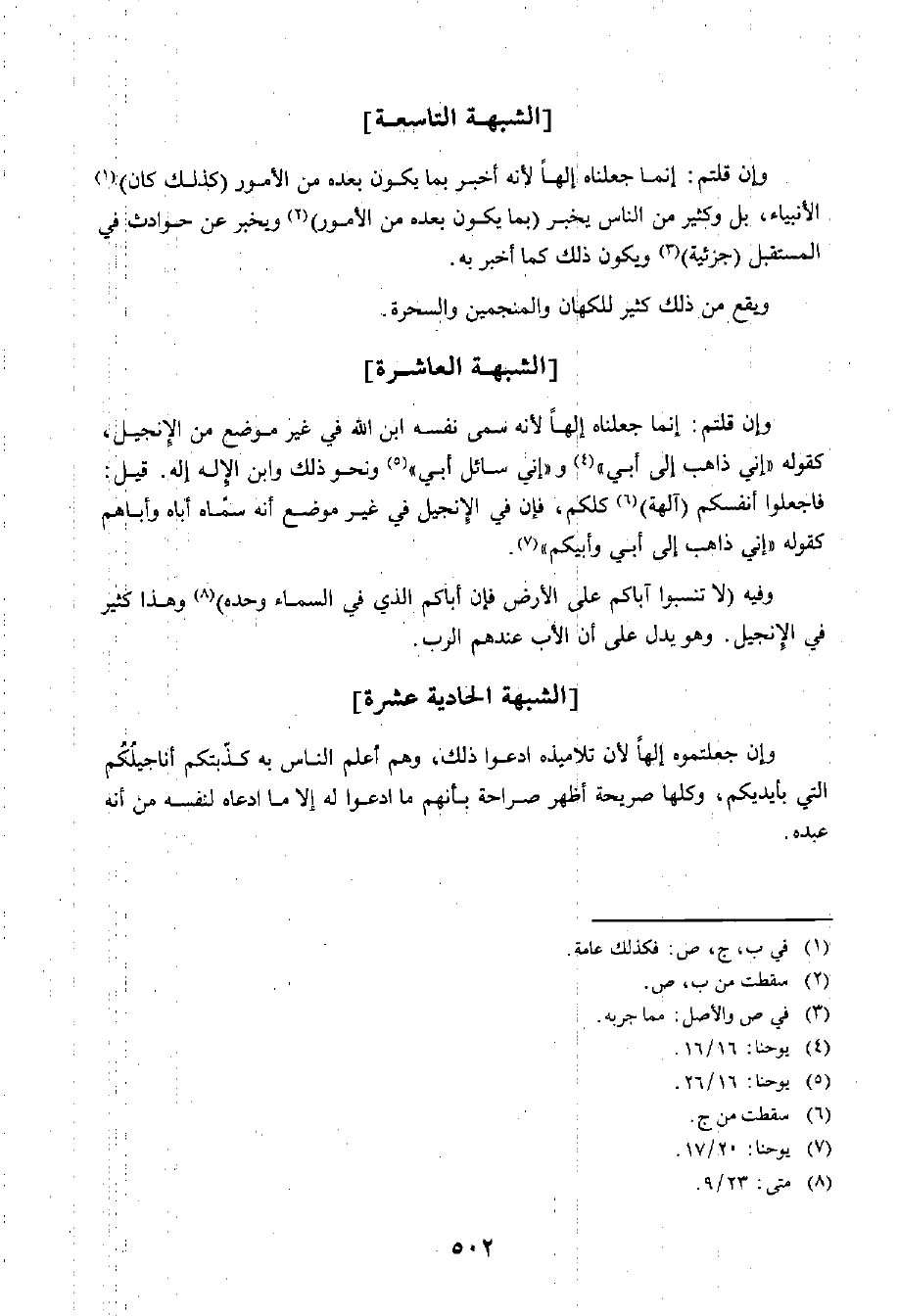 وَإِنْ قُلْتُمْ: إِنَّمَا جَعَلْنَاهُ إِلَهًا لِأَنَّهُ سَمَّى نَفْسَهُ ابْنَ اللَّهِ فِي غَيْرِ مَوْضِعٍ مِنَ الْإِنْجِيلِ، كَقَوْلِهِ: إِنِّي ذَاهِبٌ إِلَى أَبِي، وَإِنِّي سَائِلُ أَبِي، وَنَحْوَ ذَلِكَ، وَابْنُ الْإِلَهِ إِلَهٌ، قِيلَ: فَاجْعَلُوا أَنْفُسَكُمْ آلِهَةً كُلُّكُمْ، فَإِنَّ فِي الْإِنْجِيلِ فِي غَيْرِ مَوْضِعٍ أَنَّهُ سَمَّاهُ أَبَاهُ وَأَبَاهُمْ، كَقَوْلِهِ: إِنِّي ذَاهِبٌ إِلَى أَبِي وَأَبِيكُمْ.