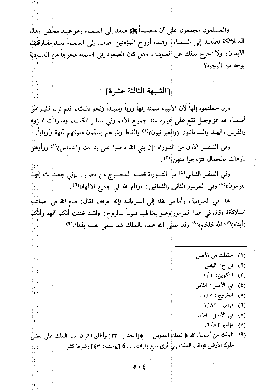 وَالْمُسْلِمُونَ مُجْمِعُونَ عَلَى أَنَّ مُحَمَّدًا - صَلَّى اللَّهُ عَلَيْهِ وَسَلَّمَ - صَعِدَ إِلَى السَّمَاءِ وَهُوَ عَبْدٌ مَحْضٌ وَهَذِهِ الْمَلَائِكَةُ تَصْعَدُ إِلَى السَّمَاءِ، وَهَذِهِ أَرْوَاحُ الْمُؤْمِنِينَ تَصْعَدُ إِلَى السَّمَاءِ بَعْدَ مُفَارَقَتِهَا الْأَبْدَانُ، وَلَا تَخْرُجُ بِذَلِكَ عَنِ الْعُبُودِيَّةِ، وَهَلْ كَانَ الصُّعُودُ إِلَى السَّمَاءِ مُخْرِجٌ عَنِ الْعُبُودِيَّةِ بِوَجْهٍ مِنَ الْوُجُوهِ؟