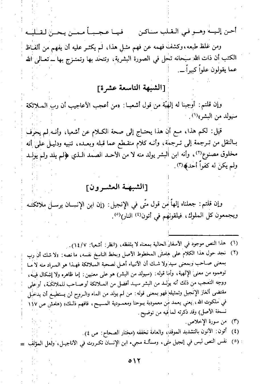 قِيلَ: لَكُمْ هَذَا، مَعَ أَنَّ هَذَا يَحْتَاجُ إِلَى صِحَّةِ الْكَلَامِ عَنْ أَشْعِيَا، وَأَنَّهُ لَمْ يُحَرَّفْ بِالنَّقْلِ مِنْ تَرْجَمَةٍ إِلَى تَرْجَمَةٍ، وَأَنَّهُ كَلَامٌ مُنْقَطِعٌ عَمَّا قَبْلَهُ وَبَعْدَهُ، تَنْبِيهٌ وَدَلِيلٌ عَلَى أَنَّهُ مَخْلُوقٌ مَصْنُوعٌ، وَأَنَّهُ ابْنُ الْبَشَرِ يُوَلَدُ مِنْهُ، لَا مِنَ الْأَحَدِ الصَّمَدِ الَّذِي لَمْ يَلِدْ وَلَمْ يُولَدْ وَلَمْ يَكُنْ لَهُ كُفُوًا أَحَدٌ.