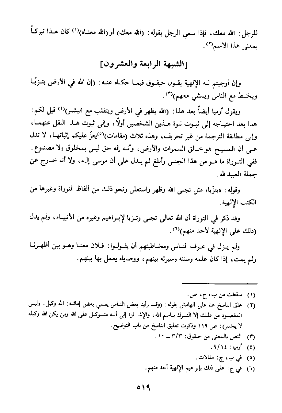 وَيَقُولُ أَرْمِيَا أَيْضًا بَعْدَ هَذَا: اللَّهُ يَظْهَرُ فِي الْأَرْضِ وَيَتَقَلَّبُ مَعَ الْبَشَرِ، قِيلَ لَكُمْ: هَذَا بَعْدَ احْتِيَاجِهِ إِلَى ثُبُوتِ هَذَيْنِ الشَّخْصَيْنِ أَوَّلًا، وَإِلَى ثُبُوتِ هَذَا النَّقْلِ عَنْهُمَا، وَإِلَى مُطَابَقَةِ التَّرْجَمَةِ مِنْ غَيْرِ تَحْرِيفٍ - وَهَذِهِ ثَلَاثُ مَقَامَاتٍ يَعِزُّ عَلَيْكُمْ إِثْبَاتُهَا - لَا تَدُلُّ عَلَى أَنَّ الْمَسِيحَ هُوَ خَالِقُ السَّمَاوَاتِ وَالْأَرْضِ، وَأَنَّهُ إِلَهٌ حَقٌّ لَيْسَ بِمَخْلُوقٍ وَلَا مَصْنُوعٍ، فَفِي التَّوْرَاةِ مَا هُوَ مِنْ هَذَا الْجِنْسِ وَأَبْلَغُ وَلَمْ يَدُلَّ ذَلِكَ عَلَى أَنَّ مُوسَى إِلَهٌ، وَلَا أَنَّهُ خَارِجٌ عَنْ جُمْلَةِ الْعَبِيدِ لِلَّهِ.