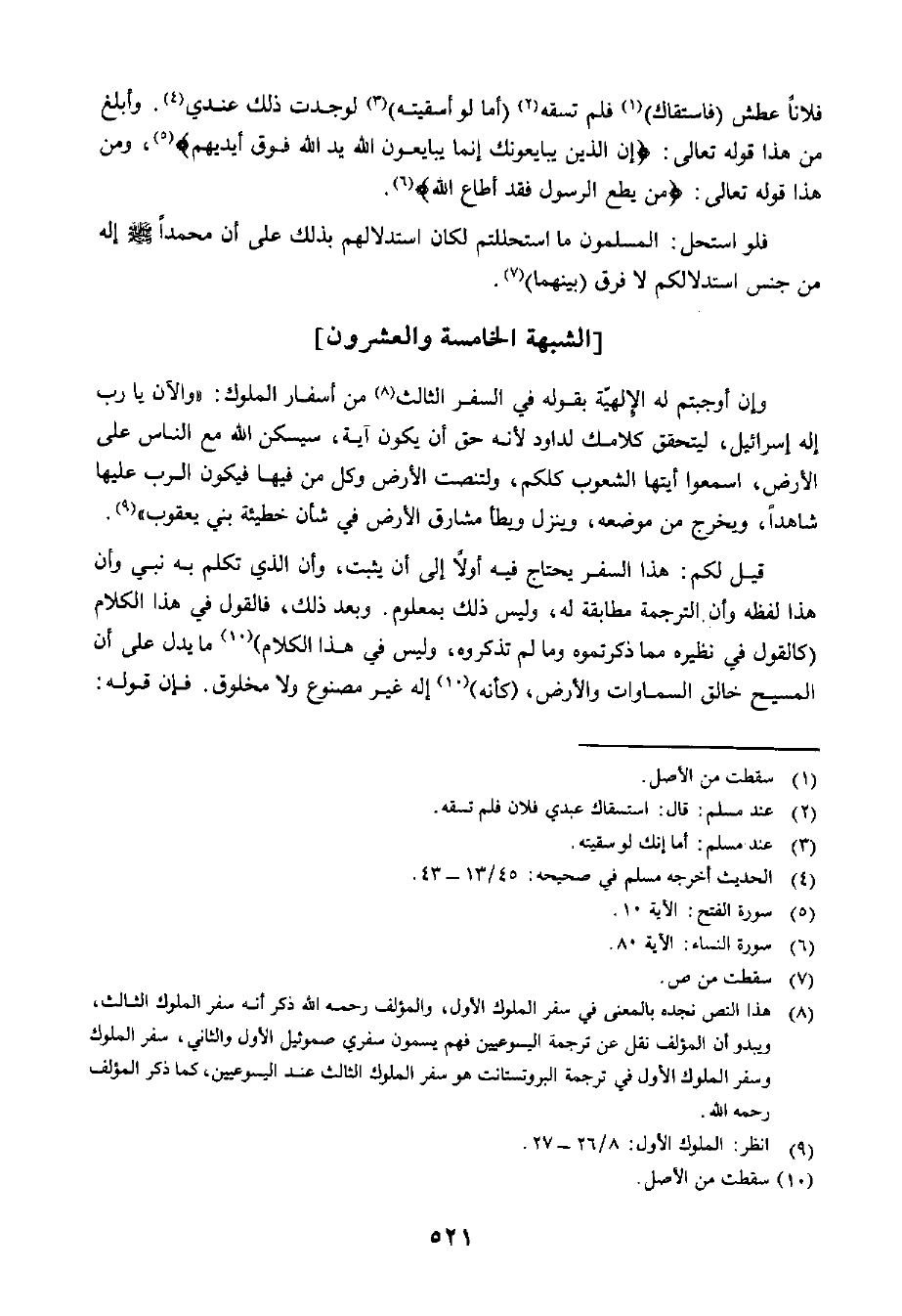 قِيلَ لَكُمْ: هَذَا السِّفْرُ يَحْتَاجُ أَوَّلًا إِلَى أَنْ يُثْبَتَ، وَأَنَّ الَّذِي تَكَلَّمَ بِهِ نَبِيٌّ، وَأَنَّ هَذَا لَفَظَهُ، وَأَنَّ التَّرْجَمَةَ مُطَابِقَةٌ لَهُ وَلَيْسَ ذَلِكَ بِمَعْلُومٍ. وَبَعْدَ ذَلِكَ فَالْقَوْلُ فِي هَذَا الْكَلَامِ كَالْقَوْلِ فِي نَظِيرِهِ مِمَّا ذَكَرْتُمُوهُ وَمَا لَمْ تَذْكُرُوهُ وَلَيْسَ فِي هَذَا الْكَلَامِ مَا يَدُلُّ عَلَى أَنَّ الْمَسِيحَ خَالِقُ السَّمَاوَاتِ وَالْأَرْضِ كَأَنَّهُ إِلَهٌ غَيْرُ مَصْنُوعٍ وَلَا مَخْلُوقٍ، وَإِنَّ قَوْلَهُ:
