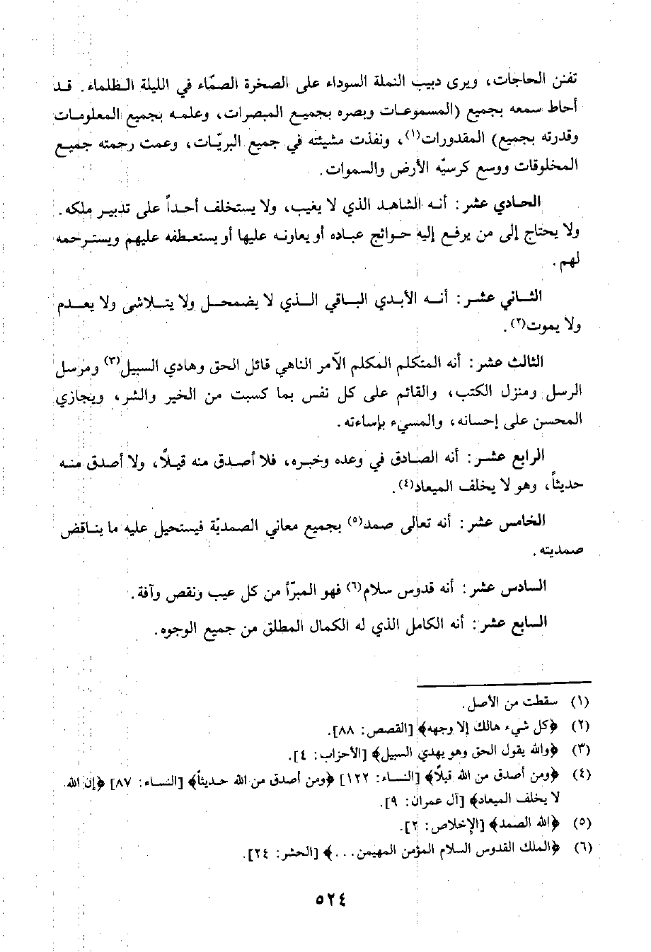 تَفَنُّنِ الْحَاجَاتِ، وَيَرَى دَبِيبَ النَّمْلَةِ السَّوْدَاءِ عَلَى الصَّخْرَةِ الصَّمَّاءِ فِي اللَّيْلَةِ الظَّلْمَاءِ، قَدْ أَحَاطَ سَمْعُهُ بِجَمِيعِ الْمَسْمُوعَاتِ، وَبَصَرُهُ بِجَمِيعِ الْمُبْصِرَاتِ، وَعِلْمُهُ بِجَمِيعِ الْمَعْلُومَاتِ، وَقُدْرَتُهُ بِجَمِيعِ الْمَقْدُورَاتِ، وَنَفَذَتْ مَشِيئَتُهُ فِي جَمِيعِ الْبَرِيَّاتِ، وَعَمَّتْ رَحْمَتُهُ جَمِيعَ الْمَخْلُوقَاتِ، وَوَسِعَ كُرْسِيُّهُ الْأَرْضَ وَالسَّمَاوَاتِ.