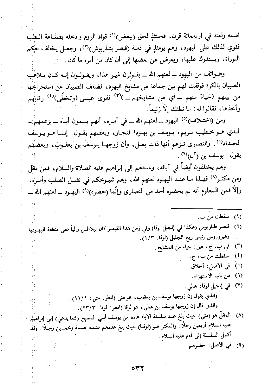 وَهُمْ يَخْتَلِفُونَ أَيْضًا فِي آبَائِهِ وَعَدَدِهِمْ إِلَى إِبْرَاهِيمِ عَلَيْهِ الصَّلَاةُ وَالسَّلَامُ فَمِنْ مُقِلٍّ وَمِنْ مُكْثِرٍ. فَهَذَا مَا عِنْدَ الْيَهُودِ لَعَنَهُمُ اللَّهُ، وَهُمْ شُيُوخُكُمْ فِي نَقْلِ الصَّلْبِ وَأَمْرِهِ، وَإِلَّا فَمِنَ الْمَعْلُومِ أَنَّهُ لَمْ يَحْضُرْهُ أَحَدٌ مِنَ النَّصَارَى. وَإِنَّمَا حَضَرَهُ الْيَهُودُ لَعَنَهُمُ اللَّهُ،