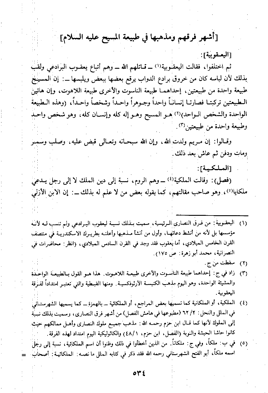 ثُمَّ اخْتَلَقُوا: فَقَالَتِ الْيَعْقُوبِيَّةُ - قَاتَلَهُمُ اللَّهُ - وَهُمْ أَتْبَاعُ يَعْقُوبَ الْبَرَادِعِيِّ وَلُقِّبَ بِذَلِكَ لِأَنَّ لِبَاسَهُ كَانَ مِنْ خُرُوقِ بِرَادِعِ الدَّوَابِّ يُرَقِّعُ بَعْضَهَا بِبَعْضٍ وَيَلْبَسُهَا - إِنَّ الْمَسِيحَ طَبِيعَةٌ وَاحِدَةٌ مِنْ طَبِيعَتَيْنِ: إِحْدَاهُمَا طَبِيعَةُ النَّاسُوتِ، وَالْأُخْرَى طَبِيعَةُ اللَّاهُوتِ، وَأَنَّ هَاتَيْنِ الطَّبِيعَتَيْنِ تَرَكَّبَتَا فَصَارَتَا إِنْسَانًا وَاحِدًا وَجْوَهَرًا وَاحِدًا وَشَخْصًا وَاحِدًا، وَهَذِهِ الطَّبِيعَةُ الْوَاحِدَةُ وَالشَّخْصُ الْوَاحِدُ هُوَ الْمَسِيحُ، هُوَ إِلَهُ كُلُّهُ وَإِنْسَانٌ كُلُّهُ، وَهُوَ شَخْصٌ وَاحِدٌ، وَطَبِيعَةٌ وَاحِدَةٌ مِنْ طَبِيعَتَيْنِ.