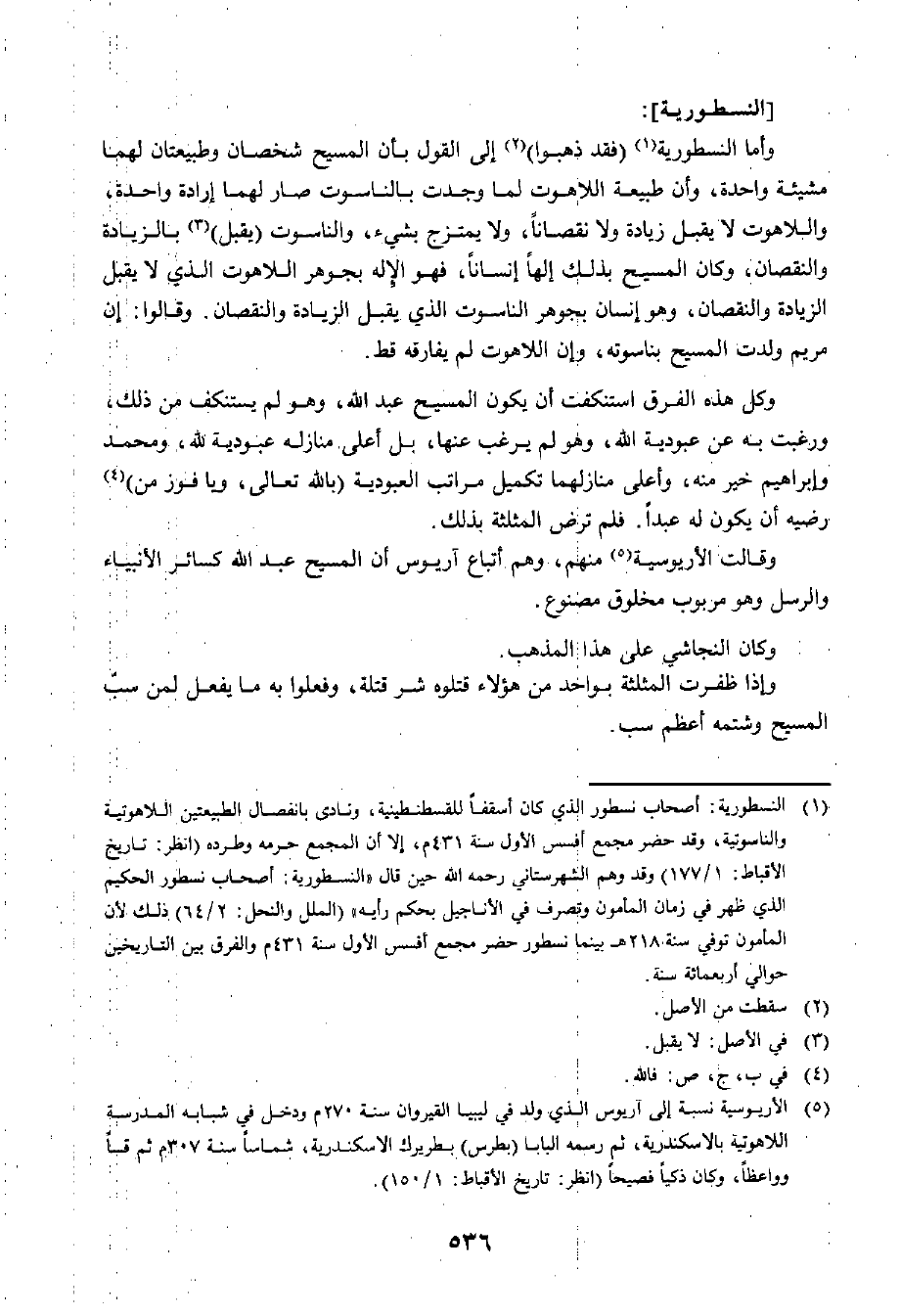 وَأَمَّا النّسْطُورِيَّةُ فَقَدْ ذَهَبُوا إِلَى الْقَوْلِ بِأَنَّ الْمَسِيحَ شَخْصَانِ وَطَبِيعَتَانِ لَهُمَا مَشِيئَةٌ وَاحِدَةٌ، وَأَنَّ طَبِيعَةَ اللَّاهُوتِ لَمَّا وُجِدَتْ بِالنَّاسُوتِ صَارَ لَهُمَا إِرَادَةٌ وَاحِدَةٌ، وَاللَّاهُوتُ لَا يَقْبَلُ زِيَادَةً وَلَا نُقْصَانًا وَلَا يَمْتَزِجُ بِشَيْءٍ، وَالنَّاسُوتُ يَقْبَلُ بِالزِّيَادَةِ وَالنُّقْصَانِ، وَكَانَ الْمَسِيحُ بِذَلِكَ إِلَهًا وَإِنْسَانًا، فَهُوَ الْإِلَهُ بِجَوْهَرِ اللَّاهُوتِ الَّذِي لَا يَقْبَلُ الزِّيَادَةَ وَالنُّقْصَانَ، وَهُوَ إِنْسَانٌ بِجَوْهَرِ النَّاسُوتِ الَّذِي يَقْبَلُ الزِّيَادَةَ وَالنُّقْصَانَ. وَقَالُوا: إِنَّ مَرْيَمَ وَلَدَتِ الْمَسِيحَ بِنَاسُوتِهِ وَإِنَّ اللَّاهُوتَ لَمْ يُفَارِقْهُ قَطُّ.