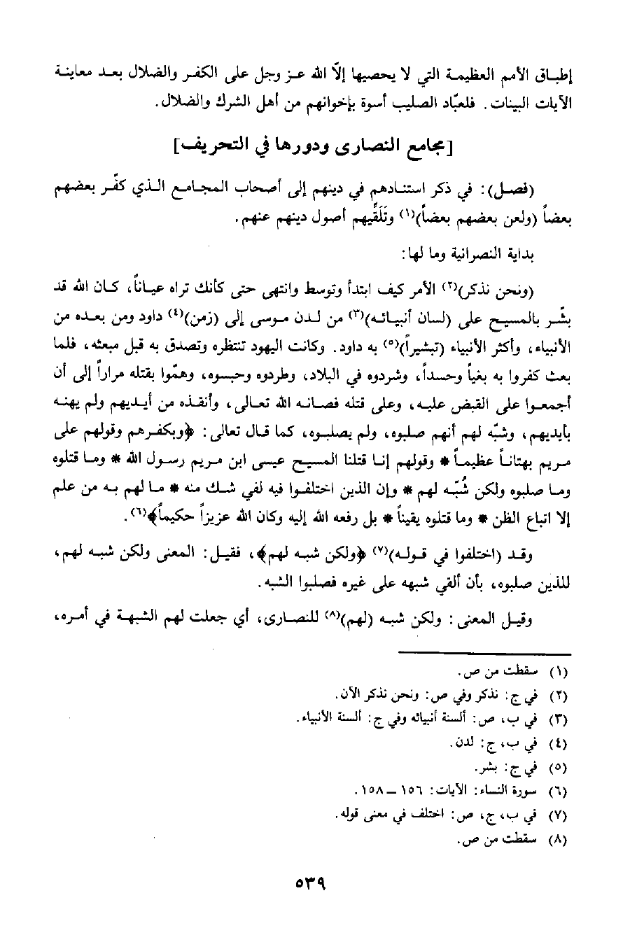 وَنَحْنُ نَذْكُرُ الْأَمْرَ كَيْفَ ابْتَدَأَ، وَتَوَسَّطَ، وَانْتَهَى، حَتَّى كَأَنَّكَ تَرَاهُ عِيَانًا. كَانَ اللَّهُ قَدْ بَشَّرَ بِالْمَسِيحِ عَلَى لِسَانِ أَنْبِيَائِهِ، مِنْ لَدُنْ مُوسَى إِلَى زَمَنِ دَاوُدَ وَمَنْ بَعْدَهُ مِنَ الْأَنْبِيَاءِ، وَأَكْثَرُ الْأَنْبِيَاءِ تَبْشِيرًا بِهِ دَاوُدُ، وَكَانَتِ الْيَهُودُ تَنْتَظِرُهُ وَتُصَدِّقُ بِهِ قَبْلَ مَبْعَثِهِ، فَلَمَّا بُعِثَ كَفَرُوا بِهِ بَغْيًا وَحَسَدًا وَشَرَّدُوهُ فِي الْبِلَادِ وَطَرَدُوهُ وَحَبَسُوهُ، وَهَمُّوا بِقَتْلِهِ مِرَارًا إِلَى أَنْ أَجْمَعُوا عَلَى الْقَبْضِ عَلَيْهِ، وَعَلَى قَتْلِهِ فَصَانَهُ اللَّهُ تَعَالَى، وَأَنْقَذَهُ مِنْ أَيْدِيهِمْ، وَلَمْ يُهِنْهُ بِأَيْدِيهِمْ، وَشُبِّهَ لَهُمْ أَنَّهُمْ صَلَبُوهُ، وَلَمْ يَصْلُبُوهُ، كَمَا قَالَ تَعَالَى: وَبِكُفْرِهِمْ وَقَوْلِهِمْ عَلَى مَرْيَمَ بُهْتَانًا عَظِيمًا وَقَوْلِهِمْ إِنَّا قَتَلْنَا الْمَسِيحَ عِيسَى ابْنَ مَرْيَمَ رَسُولَ اللَّهِ وَمَا قَتَلُوهُ وَمَا صَلَبُوهُ وَلَكِنْ شُبِّهَ لَهُمْ وَإِنَّ الَّذِينَ اخْتَلَفُوا فِيهِ لَفِي شَكٍّ مِنْهُ مَا لَهُمْ بِهِ مِنْ عِلْمٍ إِلَّا اتِّبَاعَ الظَّنِّ وَمَا قَتَلُوهُ يَقِينًا بَلْ رَفَعَهُ اللَّهُ إِلَيْهِ وَكَانَ اللَّهُ عَزِيزًا حَكِيمًا.