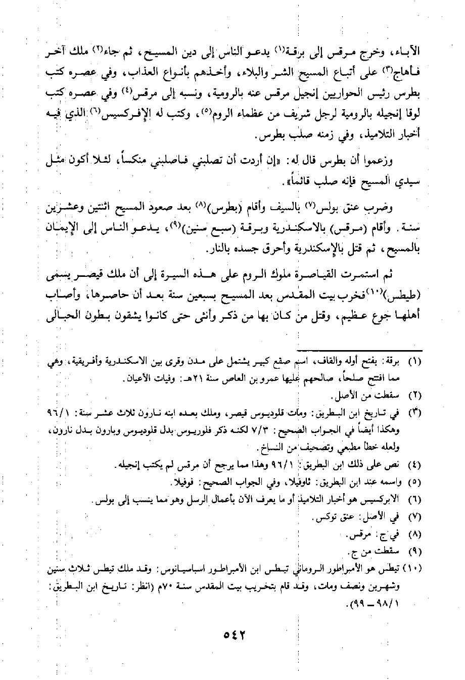 الْآبَاءِ، وَخَرَجَ مُرْقُسُ إِلَى (بَرْقَةَ) يَدْعُو النَّاسَ إِلَى دِينِ الْمَسِيحِ، ثُمَّ جَاءَ مَلِكٌ آخَرُ فَأَهَاجَ عَلَى أَتْبَاعِ الْمَسِيحِ الشَّرَّ وَالْبَلَاءَ، وَأَخَذَهُمْ بِأَنْوَاعِ الْعَذَابِ، وَفِي عَصْرِهِ كَتَبَ بُطْرُسُ رَئِيسُ الْحَوَارِيِّينَ إِنْجِيلَ مُرْقُسَ عَنْهُ بِالرُّومِيَّةِ، وَنَسَبَهُ إِلَى مُرْقُسَ. وَفِي عَصْرِهِ كَتَبَ لُوقَا إِنْجِيلَهُ بِالرُّومِيَّةِ لِرَجُلٍ شَرِيفٍ مِنْ عُظَمَاءِ الرُّومِ، وَكَتَبَ لَهُ الْإِفْرَكْسِيسَ الَّذِي فِيهِ أَخْبَارُ التَّلَامِيذِ، وَفِي زَمَنِهِ صُلِبَ بُطْرُسُ.