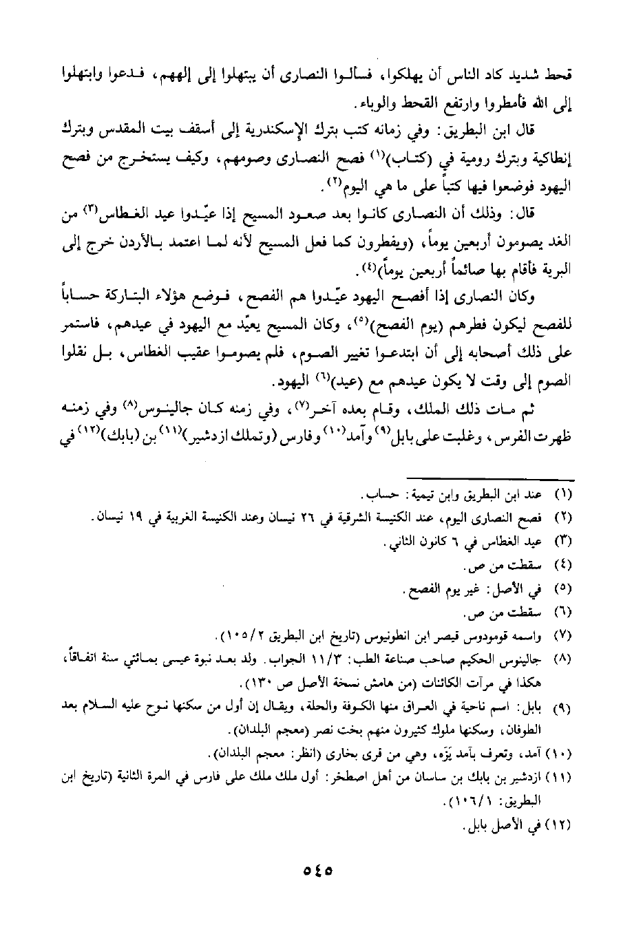 قَالَ ابْنُ الْبِطْرِيقِ: وَفِي زَمَانِهِ كَتَبَ بَتْرَكُ الْإِسْكَنْدَرِيَّةِ إِلَى أُسْقُفِّ بَيْتِ الْمَقْدِسِ، وَبَتْرَكِ أَنْطَاكِيَةَ وَبَتْرَكِ رُومِيَّةَ فِي (كِتَابٍ) فِصْحَ النَّصَارَى وَصَوْمَهُمْ، وَكَيْفَ يُسْتَخْرَجُ مِنْ فِصْحِ الْيَهُودِ، فَوَضَعُوا فِيهَا كُتُبًا عَلَى مَا هِيَ الْيَوْمَ.