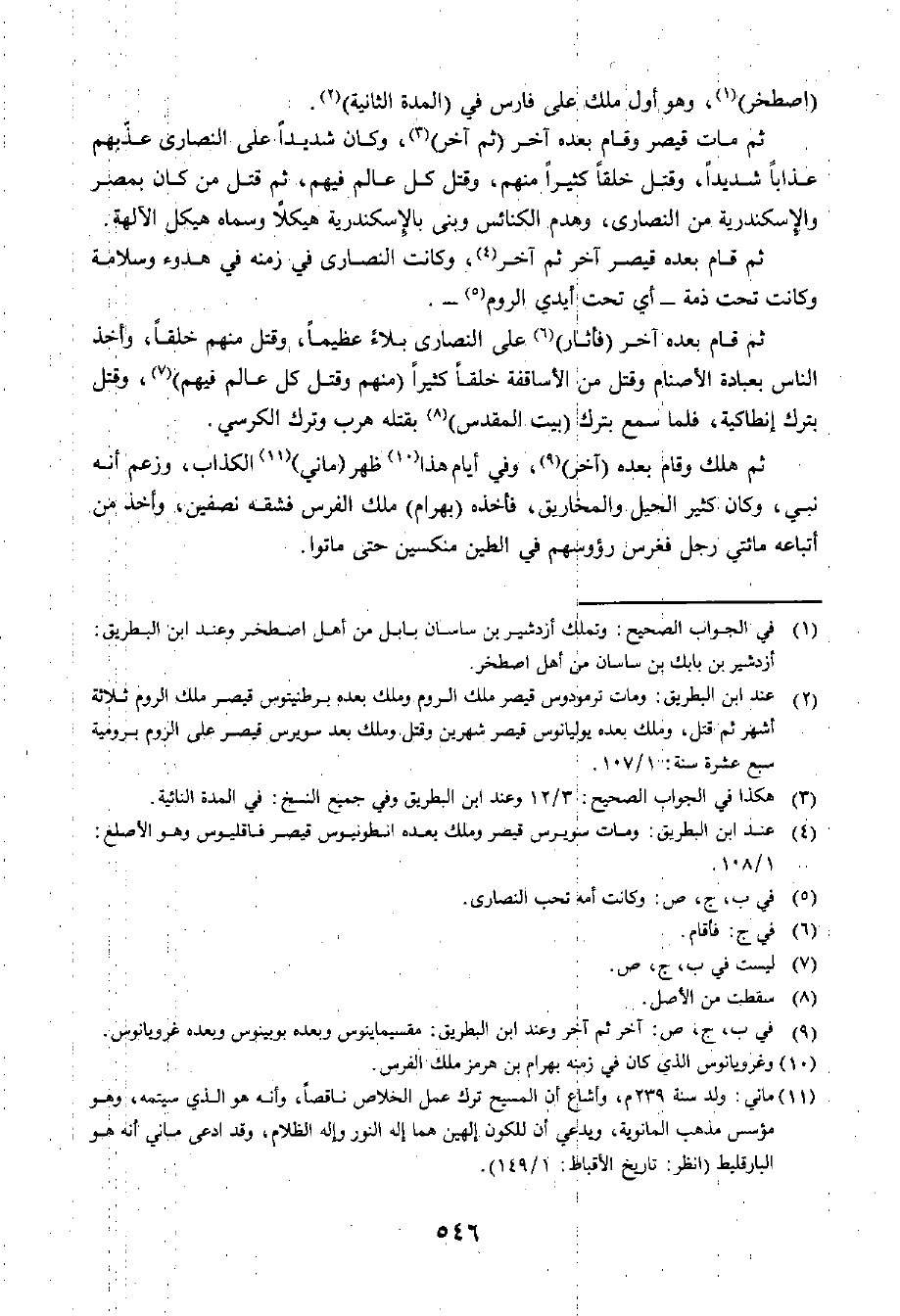 ثُمَّ هَلَكَ وَقَامَ بَعْدَهُ آخَرُ، وَفِي أَيَّامِ هَذَا ظَهَرَ مَانِي الْكَذَّابُ، وَزَعَمَ أَنَّهُ نَبِيٌّ، وَكَانَ كَثِيرَ الْحِيَلِ وَالْمَخَارِيقِ، فَأَخَذَهُ بِهْرَامُ مَلِكُ الْفُرْسِ فَشَقَّهُ نِصْفَيْنِ، وَأَخَذَ مِنْ أَتْبَاعِهِ مِائَتَيْ رَجُلٍ فَغَرَسَ رُءُوسَهُمْ فِي الطِّينِ مُنَكَّسِينَ حَتَّى مَاتُوا.
