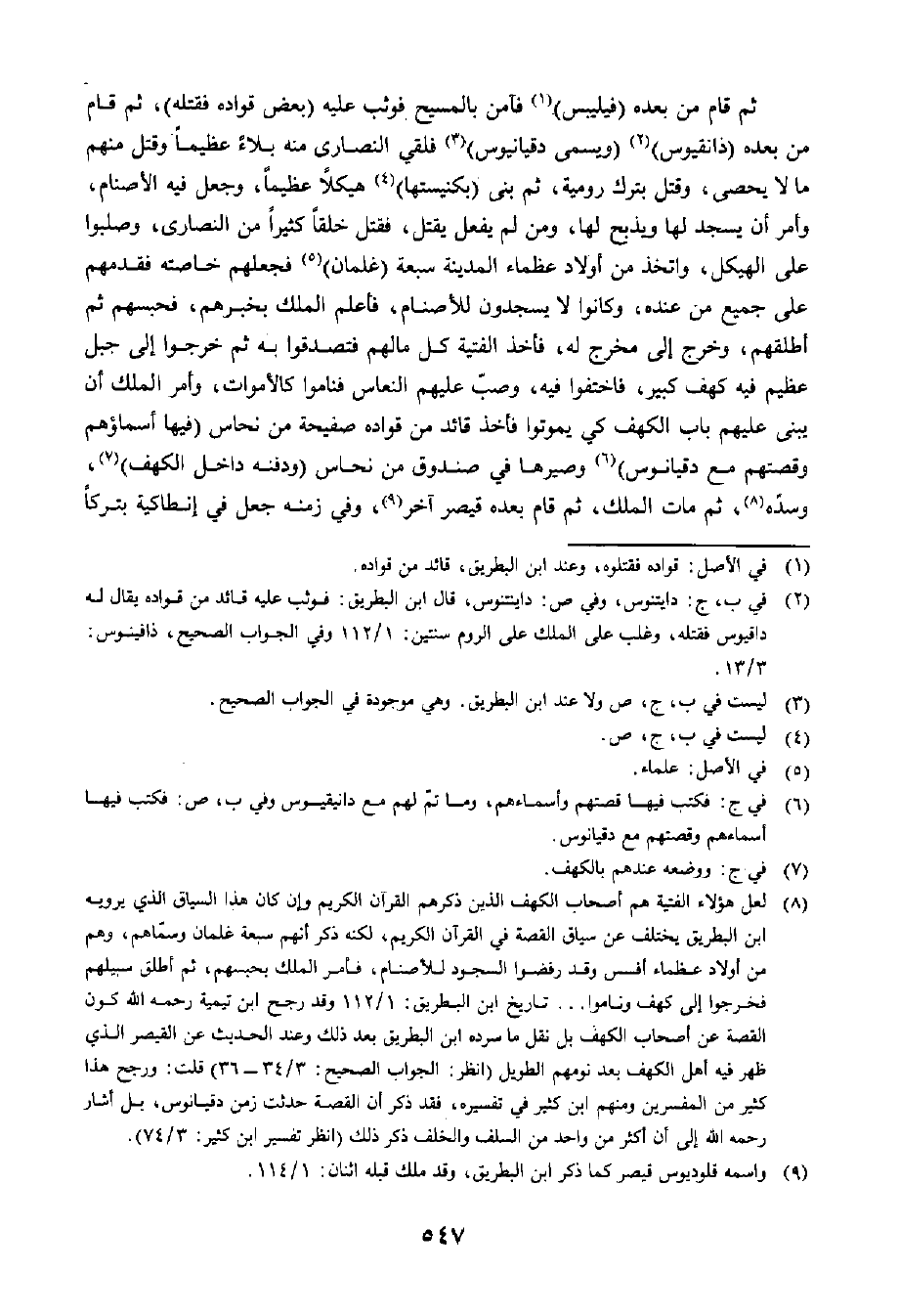 ثُمَّ قَامَ مِنْ بَعْدِهِ فِيلِيبْسُ فَآمَنَ بِالْمَسِيحِ فَوَثَبَ عَلَيْهِ بَعْضُ قُوَّادِهِ فَقَتَلَهُ، ثُمَّ قَامَ بَعْدَهُ ذَانْقِيُوسُ، وَيُسَمَّى دِقْيَانُوسُ فَلَقِيَ النَّصَارَى مِنْهُ بَلَاءً عَظِيمًا، وَقَتَلَ مِنْهُمْ مَا لَا يُحْصَى، وَقَتَلَ بَتْرَكَ رُومِيَّةَ، وَبَنَى بِكَنِيسَتِهَا هَيْكَلًا عَظِيمًا وَجَعَلَ فِيهِ الْأَصْنَامَ، وَأَمَرَ أَنْ يَسْجُدَ لَهَا وَيُذْبَحَ لَهَا، وَمَنْ لَمْ يَفْعَلْ يُقْتَلُ، فَقَتَلَ خَلْقًا كَثِيرًا مِنَ النَّصَارَى، وَصُلِبُوا عَلَى الْهَيْكَلِ، وَاتَّخَذَ مِنْ أَوْلَادِ عُظَمَاءِ الْمَدِينَةِ سَبْعَةَ غِلْمَانٍ، فَجَعَلَهُمْ خَاصَّتَهُ فَقَدَّمَهُمْ عَلَى جَمِيعِ مَنْ عِنْدَهُ، وَكَانُوا لَا يَسْجُدُونَ لِلْأَصْنَامِ، فَأُعْلِمَ الْمَلِكُ بِخَبَرِهِمْ، فَحَبَسَهُمْ ثُمَّ أَطْلَقَهُمْ، وَخَرَجَ إِلَى مَخْرِجٍ لَهُ، فَأَخَذَ الْفِتْيَةُ كُلَّ مَالِهِمْ فَتَصَدَّقُوا بِهِ، ثُمَّ خَرَجُوا إِلَى جَبَلٍ عَظِيمٍ فِيهِ كَهْفٌ كَبِيرٌ، فَاخْتَفَوْا فِيهِ، وَصَبَّ اللَّهُ عَلَيْهِمُ النُّعَاسَ فَنَامُوا كَالْأَمْوَاتِ، وَأَمَرَ الْمَلِكُ أَنْ يُبْنَى عَلَيْهِمْ بَابُ الْكَهْفِ كَيْ يَمُوتُوا، فَأَخَذَ قَائِدٌ مِنْ قُوَّادِهِ صَفِيحَةً مِنْ نُحَاسٍ، فِيهَا أَسْمَاؤُهُمْ وَقِصَّتُهُمْ مَعَ دِقْيَانُوسَ، وَصَيَّرُهَا فِي صُنْدُوقٍ مِنْ نُحَاسٍ، وَدَفَنَهُ دَاخِلَ الْكَهْفِ وَسَدَّهُ، ثُمَّ مَاتَ الْمَلِكُ، ثُمَّ قَامَ بَعْدَهُ قَيْصَرُ آخَرُ، وَفِي زَمَنِهِ جَعَلَ فِي أَنْطَاكِيَةَ بَتْرَكًا