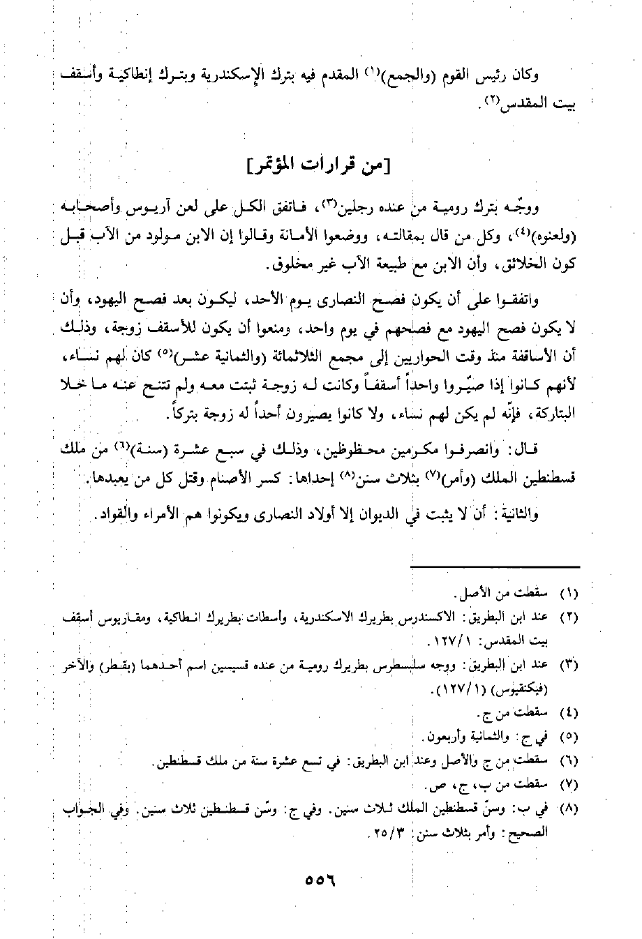 وَاتَّفَقُوا عَلَى أَنْ يَكُونَ فِصْحُ النَّصَارَى يَوْمَ الْأَحَدِ، لِيَكُونَ بَعْدَ فِصْحِ الْيَهُودِ، وَأَنْ لَا يَكُونَ فِصْحُ الْيَهُودِ مَعَ فَصْحِهِمْ فِي يَوْمٍ وَاحِدٍ، وَمَنَعُوا أَنْ يَكُونَ لِلْأُسْقُفِّ زَوْجَةٌ، وَذَلِكَ أَنَّ الْأَسَاقِفَةَ مُنْذُ وَقْتِ الْحَوَارِيِّينَ إِلَى مَجْمَعِ الثَّلَاثِمِائَةِ وَالثَّمَانِيَةَ عَشَرَ كَانَ لَهُمْ نِسَاءٌ، لِأَنَّهُمْ كَانُوا إِذَا صَيَّرُوا وَاحِدًا أُسْقُفًّا وَكَانَتْ لَهُ زَوْجَةٌ ثَبَتَتْ مَعَهُ وَلَمْ تَتَنَحَّ عَنْهُ مَا خَلَا الْبَتَارِكَةَ، فَإِنَّهُ لَمْ يَكُنْ لَهُمْ نِسَاءٌ، وَلَا كَانُوا يُصَيِّرُونَ أَحَدًا لَهُ زَوْجَةٌ بَتْرَكًا.