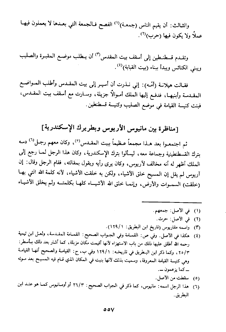 ثُمَّ اجْتَمَعُوا بَعْدَ هَذَا مَجْمَعًا عَظِيمًا بِبَيْتِ الْمَقْدِسِ، وَكَانَ مَعَهُمْ رَجُلٌ دَسَّهُ بَتْرَكُ الْقُسْطَنْطِينِيَّةِ وَجَمَاعَةٌ مَعَهُ، لِيَسْأَلُوا بَتْرَكَ الْإِسْكَنْدَرِيَّةِ، وَكَانَ هَذَا الرَّجُلُ لَمَّا رَجَعَ إِلَى الْمَلِكِ أَظْهَرَ أَنَّهُ مُخَالِفٌ لِآرِيُوسَ، وَكَانَ يَرَى رَأْيَهُ وَيَقُولُ بِمَقَالَتِهِ، فَقَامَ الرَّجُلُ وَقَالَ: إِنَّ آرِيُوسَ لَمْ يَقُلْ إِنَّ الْمَسِيحَ خَلَقَ الْأَشْيَاءَ وَلَكِنْ بِهِ خُلِقَتِ الْأَشْيَاءُ، لِأَنَّهُ كَلِمَةُ اللَّهِ الَّتِي بِهَا خُلِقَتِ السَّمَاوَاتُ وَالْأَرْضُ، وَإِنَّمَا خَلَقَ اللَّهُ الْأَشْيَاءَ بِكَلِمَتِهِ، وَلَمْ يَخْلُقِ الْأَشْيَاءَ