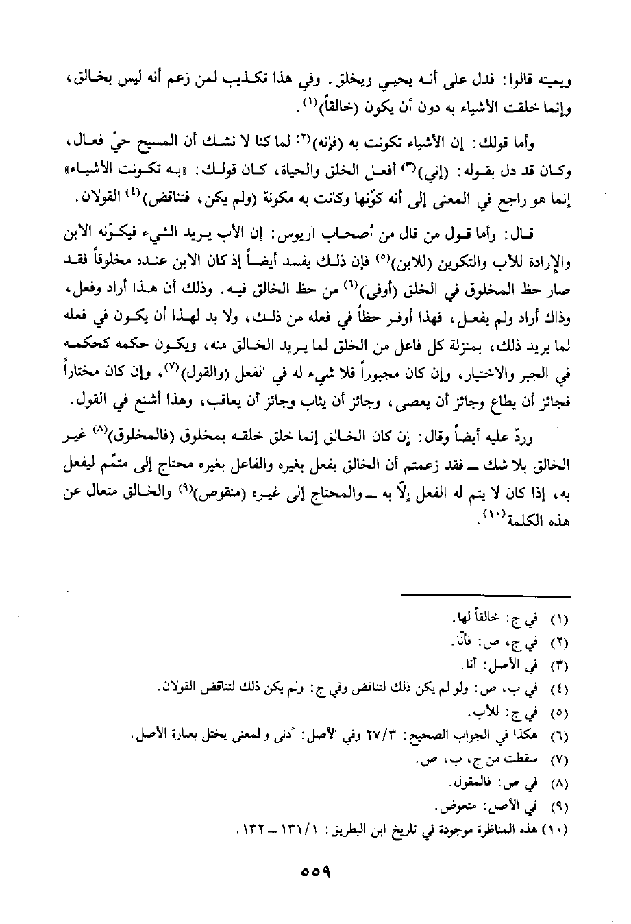 قَالَ: وَأَمَّا قَوْلُ مَنْ قَالَ مِنْ أَصْحَابِ آرِيُوسَ: إِنَّ الْأَبَ يُرِيدُ الشَّيْءَ فَيُكَوِّنُهُ الِابْنُ، وَالْإِرَادَةُ لِلْأَبِ وَالتَّكْوِينُ لِلِابْنِ. فَإِنَّ ذَلِكَ يَفْسُدُ أَيْضًا إِذَا كَانَ الِابْنُ عِنْدَهُ مَخْلُوقًا، فَقَدْ صَارَ حَظُّ الْمَخْلُوقِ فِي الْخَلْقِ أَوْفَى مِنْ حَظِّ الْخَالِقِ فِيهِ، وَذَلِكَ أَنَّ هَذَا أَرَادَ وَفَعَلَ. وَذَلِكَ أَرَادَ وَلَمْ يَفْعَلْ، فَهَذَا أَوْفَرُ حَظًّا فِي فِعْلِهِ مِنْ ذَلِكَ، وَلَا بُدَّ لِهَذَا أَنْ يَكُونَ فِي فِعْلِهِ لِمَا يُرِيدُ ذَلِكَ بِمَنْزِلَةِ كُلِّ فَاعِلٍ مِنَ الْخَلْقِ لِمَا يُرِيدُ الْخَالِقُ مِنْهُ، وَيَكُونُ حُكْمُهُ كَحُكْمِهِ فِي الْجَبْرِ وَالِاخْتِيَارِ، وَإِنْ كَانَ مَجْبُورًا فَلَا شَيْءَ لَهُ فِي الْفِعْلِ، وَإِنْ كَانَ مُخْتَارًا فَجَائِزٌ أَنْ يُطَاعَ وَجَائِزٌ أَنْ يُعْصَى، وَجَائِزٌ أَنْ يُثَابَ وَجَائِزٌ أَنْ يُعَاقَبَ، وَهَذَا أَشْنَعُ فِي الْقَوْلِ.