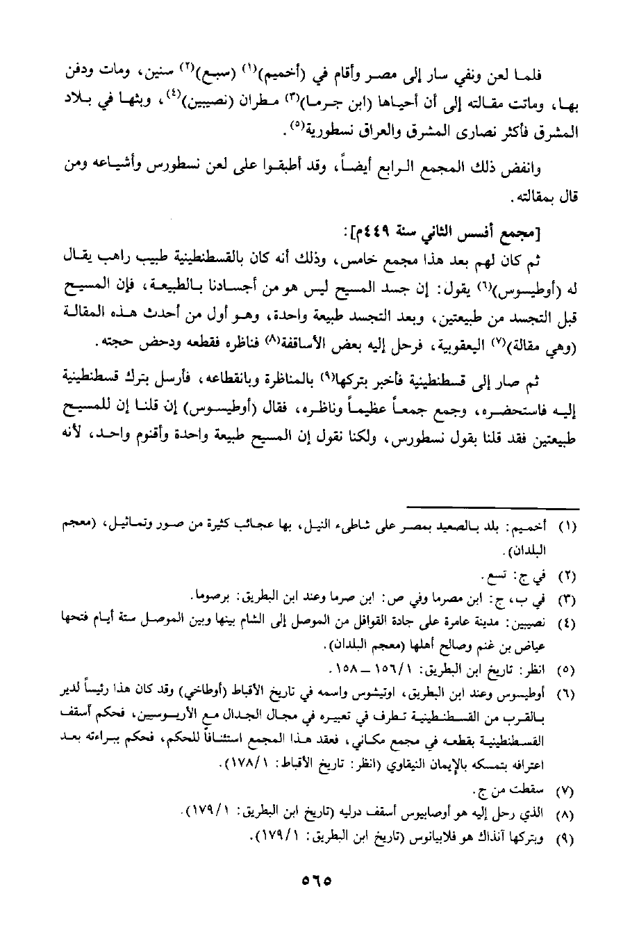 ثُمَّ كَانَ لَهُمْ بَعْدَ هَذَا مَجْمَعٌ خَامِسٌ، وَذَلِكَ أَنَّهُ كَانَ بِالْقُسْطَنْطِينِيَّةِ طَبِيبٌ رَاهِبٌ يُقَالُ لَهُ: أُوطِيسُوسُ يَقُولُ: إِنَّ جَسَدَ الْمَسِيحِ لَيْسَ هُوَ مِنْ أَجْسَادِنَا بِالطَّبِيعَةِ، فَإِنَّ الْمَسِيحَ قَبْلَ التَّجَسُّدِ مِنْ طَبِيعَتَيْنِ، وَبَعْدَ التَّجَسُّدِ طَبِيعَةٌ وَاحِدَةٌ، وَهُوَ أَوَّلُ مَنْ أَحْدَثَ هَذِهِ الْمَقَالَةَ وَهِيَ مَقَالَةُ الْيَعْقُوبِيَّةِ، فَرَحَلَ إِلَيْهِ بَعْضُ الْأَسَاقِفَةِ، فَنَاظَرَهُ وَقَطَعَهُ وَدَحَضَ حُجَّتَهُ.