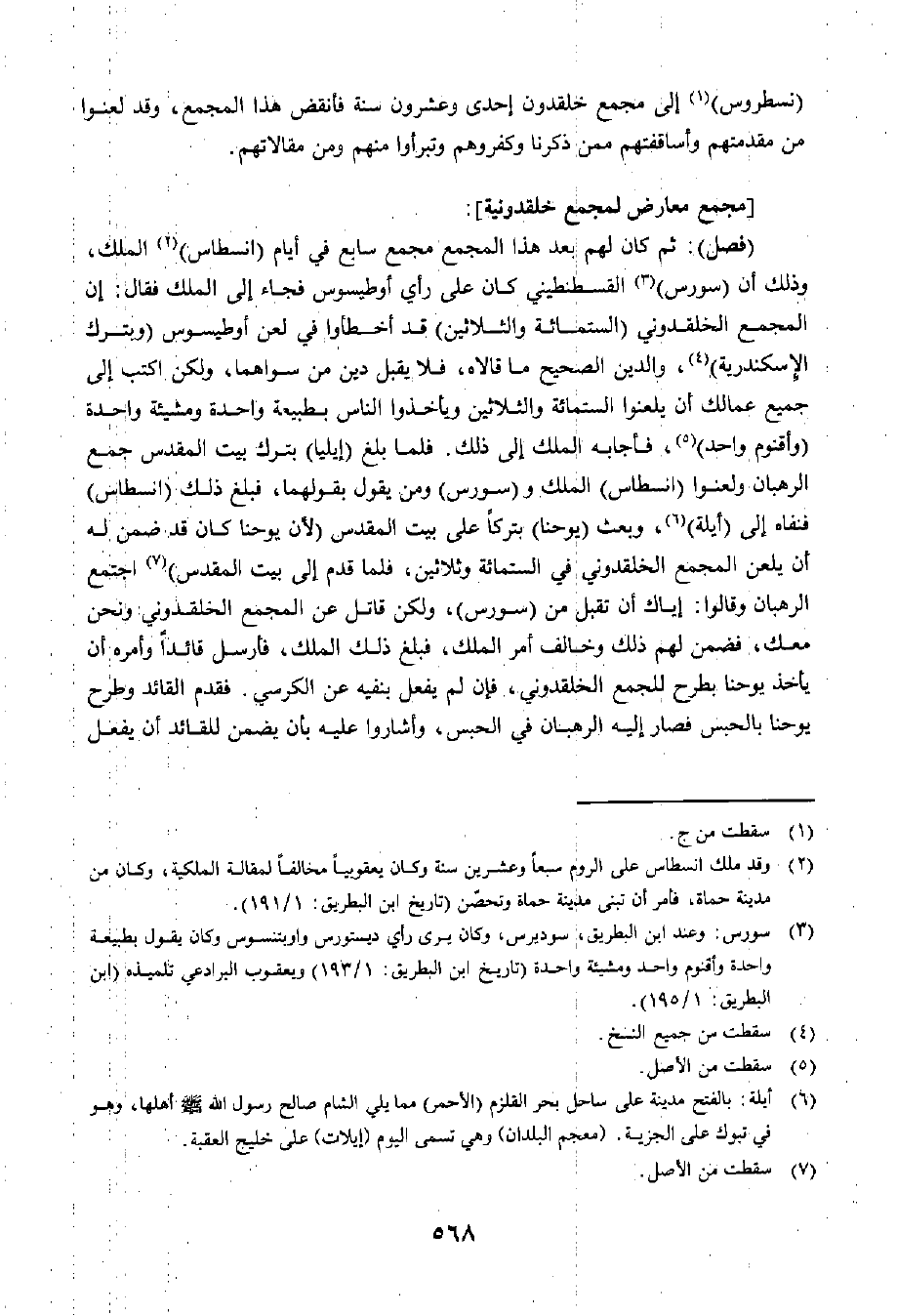 فَصْلٌ: ثُمَّ كَانَ لَهُمْ بَعْدَ هَذَا الْمَجْمَعِ مَجْمَعٌ سَابِعٌ فِي أَيَّامِ انِسْطَاسَ الْمَلِكِ، وَذَلِكَ أَنْ سُورُسَ الْقُسْطَنْطِينِيَّ كَانَ عَلَى رَأْيِ أُوطِيسُوسَ فَجَاءَ إِلَى الْمَلِكِ فَقَالَ: إِنَّ الْمَجْمَعَ الْخَلْقَدُونِيَّ السِّتَّمِائَةَ وَالثَّلَاثِينَ قَدْ أَخْطَئُوا فِي لَعْنِ أُوطِيسُوسَ وَبَتْرَكِ الْإِسْكَنْدَرِيَّةِ، وَالدِّينُ الصَّحِيحُ مَا قَالَاهُ، فَلَا يُقْبَلُ دِينُ مَنْ سِوَاهُمَا، وَلَكِنِ اكْتُبْ إِلَى جَمِيعِ عُمَّالِكَ أَنْ يَلْعَنُوا السِّتَّمِائَةِ وَالثَّلَاثِينَ وَيَأْخُذُوا النَّاسَ بِطَبِيعَةٍ وَاحِدَةٍ، وَمَشِيئَةٍ وَاحِدَةٍ، وَأُقْنُومٍ وَاحِدٍ، فَأَجَابَهُ الْمَلِكُ إِلَى ذَلِكَ، فَلَمَّا بَلَغَ ذَلِكَ إِيلِيَا بَتْرَكَ بَيْتِ الْمَقْدِسِ جَمَعَ الرُّهْبَانَ وَلَعَنُوا انِسْطَاسَ الْمَلِكَ، وَسُورُسَ وَمَنْ يَقُولُ بِقَوْلِهِمَا، فَبَلَغَ ذَلِكَ انِسْطَاسَ فَنَفَاهُ إِلَى أَيْلَةَ، وَبَعَثَ يُوحَنَّا بَتْرَكًا عَلَى بَيْتِ الْمَقْدِسِ لِأَنَّ يُوحَنَّا كَانَ قَدْ ضَمِنَ لَهُ أَنْ يَلْعَنَ الْمَجْمَعَ الْخَلْقَدُونِيَّ فِي السِّتِّمِائَةِ وَثَلَاثِينَ، فَلَمَّا قَدِمَ إِلَى بَيْتِ الْمَقْدِسِ اجْتَمَعَ الرُّهْبَانُ وَقَالُوا: إِيَّاكَ أَنْ تَقْبَلَ مِنْ سُورُسَ، وَلَكِنْ قَاتِلْ عَنِ الْمَجْمَعِ الْخَلْقَدُونِيِّ وَنَحْنُ مَعَكَ، فَضَمِنَ لَهُمْ ذَلِكَ وَخَالَفَ أَمْرَ الْمَلِكِ، فَبَلَغَ ذَلِكَ الْمَلِكَ، فَأَرْسَلَ قَائِدًا وَأَمَرَهُ أَنْ يَأْخُذَ يُوحَنَّا بِطَرْحٍ لِلْجَمْعِ الْخَلْقَدُونِيِّ، فَإِنْ لَمْ يَفْعَلْ بِنَفْيِهِ عَنِ الْكُرْسِيِّ، فَقِدَمَ الْقَائِدُ وَطَرَحَ يُوحَنَّا بِالْحَبْسِ فَصَارَ إِلَيْهِ الرُّهْبَانُ فِي الْحَبْسِ، وَأَشَارُوا عَلَيْهِ بِأَنْ يَضْمَنَ لِلْقَائِدِ أَنْ يَفْعَلَ