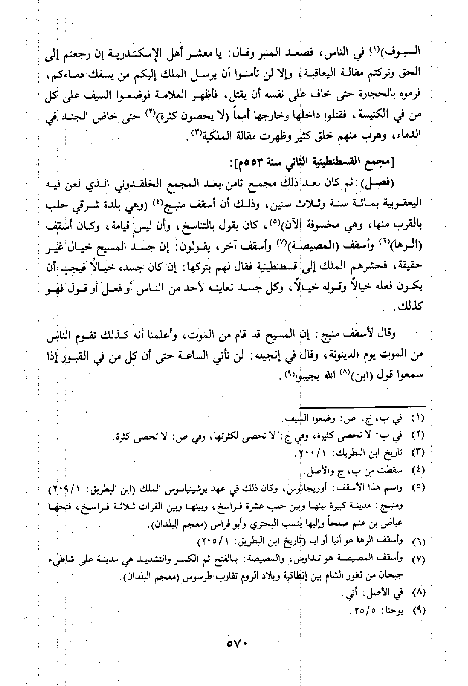 فَصَلَ: ثُمَّ كَانَ لَهُمْ بَعْدَ ذَلِكَ مَجْمَعٌ ثَامِنٌ بَعْدِ الْمَجْمَعِ الْخَلْقَدُونِيِّ الَّذِي لُعِنَ فِيهِ الْيَعْقُوبِيَّةُ بِمِائَةِ سَنَةٍ وَثَلَاثِ سِنِينَ، وَذَلِكَ أَنَّ أُسْقُفَّ مَنْبِجَ - وَهِيَ بَلْدَةٌ شَرْقِيُّ حَلَبَ بِالْقُرْبِ مِنْهَا، وَهِيَ مَخْسُوفَةٌ الْآنَ - كَانَ يَقُولُ بِالتَّنَاسُخِ، وَأَنْ لَيْسَ قِيَامَةٌ، وَكَانَ أُسْقُفُّ الرُّهَا، وَأَسْقُفُّ الْمِصِّيصَةِ، وَأُسْقُفٌّ آخَرُ، يَقُولُونَ: إِنَّ جَسَدَ الْمَسِيحِ خَيَالٌ غَيْرَ حَقِيقَةٍ، فَحَشَرَهُمُ الْمَلِكُ إِلَى قُسْطَنْطِينِيَّةَ فَقَالَ لَهُمْ بَتْرَكُهَا: إِنْ كَانَ جَسَدُهُ خَيَالًا فَيَجِبُ أَنْ يَكُونَ فِعْلُهُ خَيَالًا وَقَوْلُهُ خَيَالًا، وَكُلُّ جَسَدٍ نُعَايِنُهُ لِأَحَدٍ مِنَ النَّاسِ أَوْ فِعْلٍ أَوْ قَوْلٍ فَهُوَ كَذَلِكَ.
