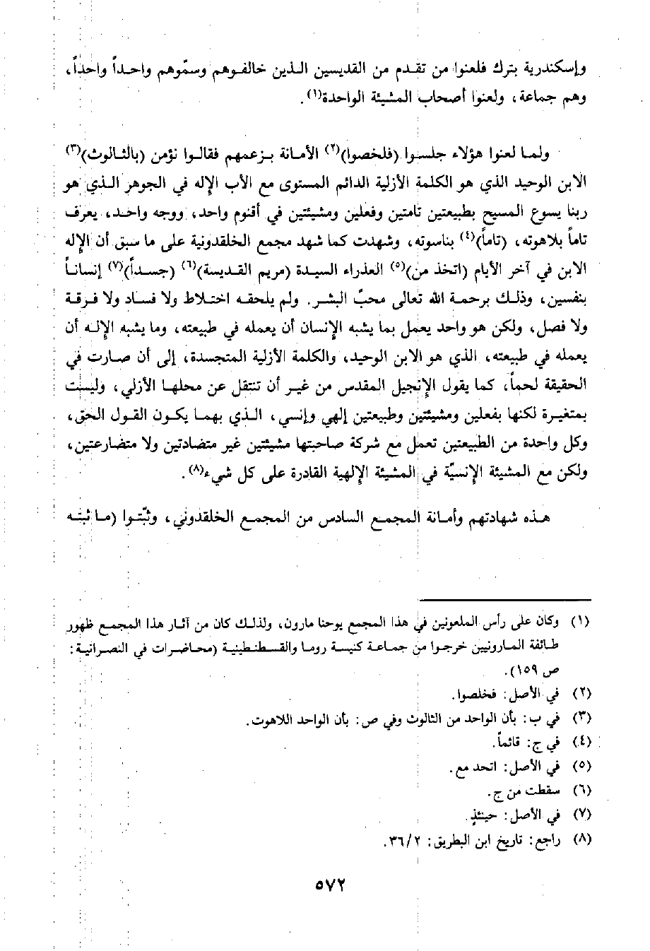 وَلَمَّا لَعَنُوا هَؤُلَاءِ جَلَسُوا فَلَخَّصُوا الْأَمَانَةَ بِزَعْمِهِمْ، فَقَالُوا: نُؤْمِنُ بِالثَّالُوثِ الِابْنِ الْوَحِيدِ الَّذِي هُوَ الْكَلِمَةُ الْأَزَلِيَّةُ الدَّائِمُ الْمُسْتَوِي مَعَ الْأَبِ الْإِلَهِ فِي الْجَوْهَرِ الَّذِي هُوَ رَبُّنَا يَسُوعُ الْمَسِيحُ بِطَبِيعَتَيْنِ تَامَّتَيْنِ، وَفِعْلَيْنِ وَمَشِيئَتَيْنِ فِي أُقْنُومٍ وَاحِدٍ، وَوَجْهٍ وَاحِدٍ، يُعْرَفُ تَامًّا بِلَاهُوتِهِ، تَامًّا بِنَاسُوتِهِ، وَشَهِدَ كَمَا شَهِدَ مَجْمَعُ الْخَلْقَدُونِيَّةِ عَلَى مَا سَبَقَ أَنَّ الْإِلَهَ الِابْنَ فِي آخِرِ الْأَيَّامِ اتَّخَذَ مِنَ الْعَذْرَاءِ السَّيِّدَةِ مَرْيَمَ الْقِدِّيسَةِ جَسَدًا إِنْسَانًا بِنَفْسَيْنِ، وَذَلِكَ بِرَحْمَةِ اللَّهِ تَعَالَى مُحِبِّ الْبَشَرِ، وَلَمْ يَلْحَقْهُ اخْتِلَاطٌ وَلَا فَسَادٌ وَلَا فُرْقَةٌ وَلَا فَصْلٌ، وَلَكِنْ هُوَ وَاحِدٌ يَعْمَلُ بِمَا يُشْبِهُ الْإِنْسَانَ أَنْ يَعْمَلَهُ فِي طَبِيعَتِهِ، وَمَا يُشْبِهُ الْإِلَهَ أَنْ يَعْمَلَ فِي طَبِيعَتِهِ، الَّذِي هُوَ الِابْنُ الْوَحِيدُ، وَالْكَلِمَةُ الْأَزَلِيَّةُ الْمُتَجَسِّدَةُ، إِلَى أَنْ صَارَتْ فِي الْحَقِيقَةِ لَحْمًا، كَمَا يَقُولُ الْإِنْجِيلُ الْمُقَدَّسُ مِنْ غَيْرِ أَنْ تَنْتَقِلَ عَنْ مَحَلِّهَا الْأَزَلِيِّ، وَلَيْسَتْ بِمُتَغَيِّرَةٍ، لَكِنَّهَا بِفِعْلَيْنِ وَمَشِيئَتَيْنِ وَطَبِيعَتَيْنِ: إِلَهِيٍّ، وَإِنْسِيٍّ، الَّذِي بِهِمَا يَكُونُ الْقَوْلُ الْحَقُّ، وَكُلُّ وَاحِدَةٍ مِنَ الطَّبِيعَتَيْنِ تَعْمَلُ مَعَ شَرِكَةِ صَاحِبَتِهَا مَشِيئَتَيْنِ غَيْرِ مُتَضَادَّتَيْنِ وَلَا مُتَضَارِعَتَيْنِ، وَلَكِنْ مَعَ الْمَشِيئَةِ الْإِنْسِيَّةِ الْإِلَهِيَّةِ الْقَادِرَةِ عَلَى كُلِّ شَيْءٍ.