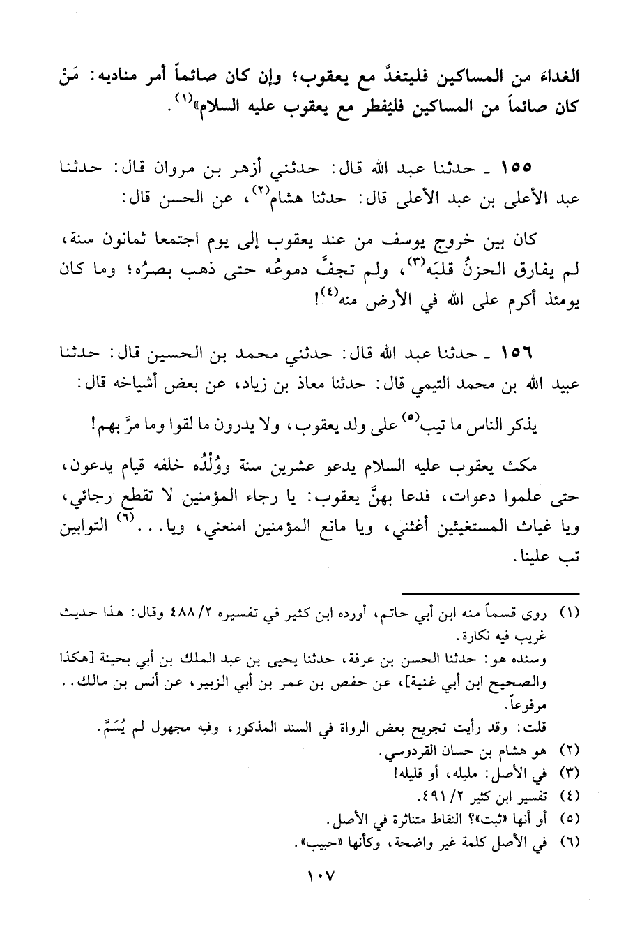 155 - حَدَّثَنَا عَبْدُ اللَّهِ قَالَ: حَدَّثَنِي أَزْهَرُ بْنُ مَرْوَانَ، قَالَ: حَدَّثَنَا عَبْدُ الْأَعْلَى بْنُ عَبْدِ الْأَعْلَى، قَالَ: حَدَّثَنَا هِشَامٌ، عَنِ الْحَسَنِ، قَالَ: «§كَانَ بَيْنَ خُرُوجِ يُوسُفَ مِنْ عِنْدِ يَعْقُوبَ إِلَى يَوْمِ اجْتَمَعَا ثَمَانُونَ سَنَةً، لَمْ يُفَارِقِ الْحُزْنُ قَلْبَهُ، وَلَمْ تَجِفَّ دُمُوعُهُ حَتَّى ذَهَبَ بَصَرُهُ؛ وَمَا كَانَ يَوْمَئِذٍ أَكْرَمُ عَلَى اللَّهِ فِي الْأَرْضِ مِنْهُ»