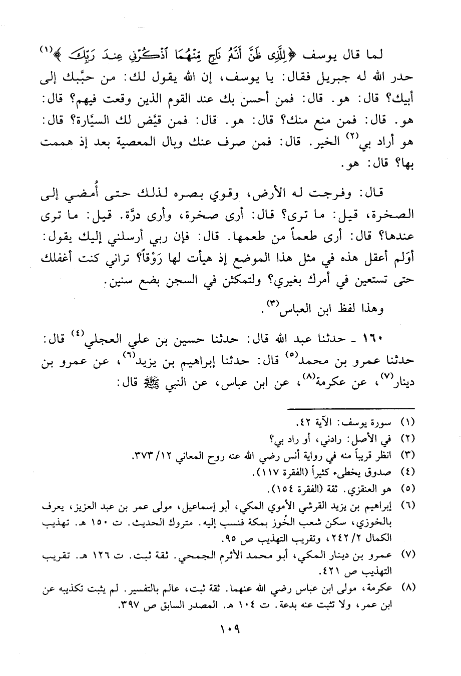160 - حَدَّثَنَا عَبْدُ اللَّهِ قَالَ: حَدَّثَنَا حُسَيْنُ بْنُ عَلِيٍّ الْعِجْلِيُّ، قَالَ: حَدَّثَنَا عَمْرُو بْنُ مُحَمَّدٍ، قَالَ: حَدَّثَنَا إِبْرَاهِيمُ بْنُ يَزِيدَ، عَنْ عَمْرِو بْنِ دِينَارٍ، عَنْ عِكْرِمَةَ، عَنِ ابْنِ عَبَّاسٍ، عَنِ النَّبِيِّ صَلَّى اللَّهُ عَلَيْهِ وَسَلَّمَ قَالَ: -[110]- «عَجِبْتُ لِصَبْرِ أَخِي يُوسُفَ عَلَيْهِ السَّلَامُ وَكَرَمِهِ، وَاللَّهُ يَغْفِرُ لَهُ، حَيْثُ أُتِيَ لِيَخْرُجَ مِنَ السِّجْنِ فَلَمْ يَخْرُجْ حَتَّى يُخْبِرَهُمْ بِعُذْرِهِ، وَلَوْ كُنْتُ أَنَا لَبَادَرْتُ الْبَابَ، §وَلَوْ لَمْ يَقُلِ الْكَلِمَةَ الَّتِي قَالَ مَا لَبِثَ فِي السِّجْنِ طُولَ مَا لَبِثَ، حَيْثُ سَعَى الْخُرُوجَ مِنْ عِنْدِ غَيْرِ اللَّهِ»
