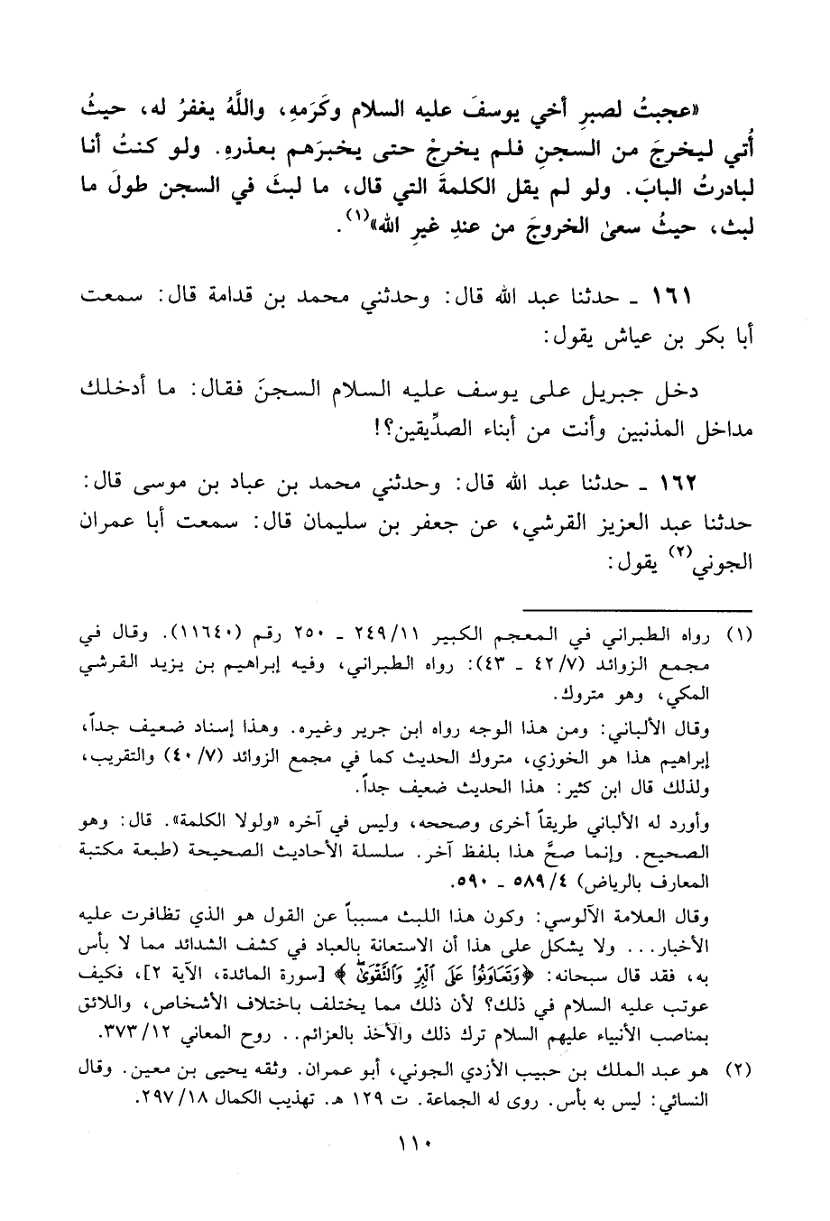 161 - حَدَّثَنَا عَبْدُ اللَّهِ قَالَ: وَحَدَّثَنِي مُحَمَّدُ بْنُ قُدَامَةَ، قَالَ: سَمِعْتُ أَبَا بَكْرِ بْنَ عَيَّاشٍ، يَقُولُ: " §دَخَلَ جِبْرِيلُ عَلَى يُوسُفَ عَلَيْهِ السَّلَامُ السِّجْنَ فَقَالَ: مَا أَدْخَلَكَ مَدَاخِلَ الْمُذْنِبِينَ وَأَنْتَ مِنْ أَبْنَاءِ الصِّدِّيقِينَ؟ "