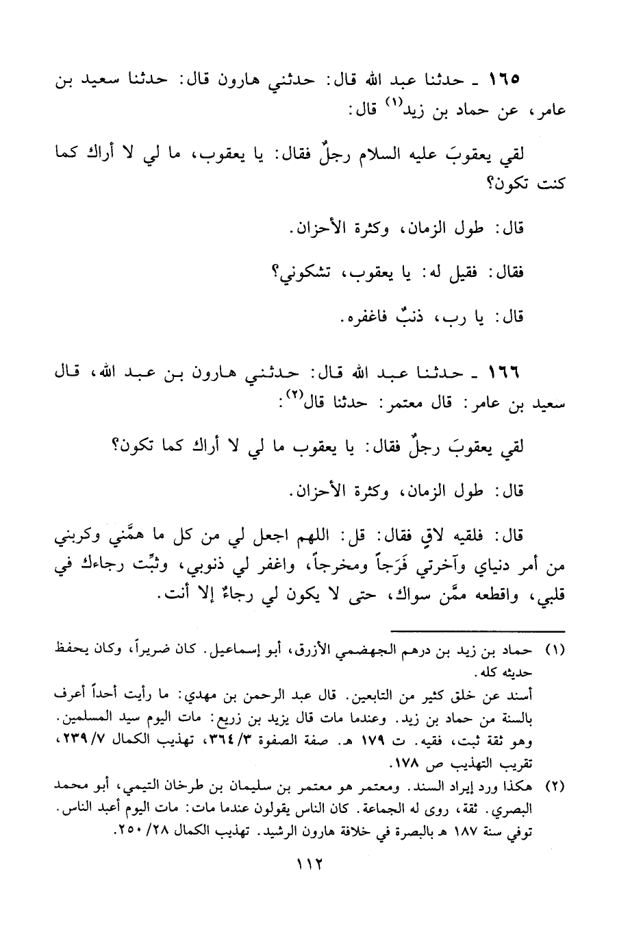 165 - حَدَّثَنَا عَبْدُ اللَّهِ قَالَ: حَدَّثَنِي هَارُونُ، قَالَ: حَدَّثَنَا سَعِيدُ بْنُ عَامِرٍ، عَنْ حَمَّادِ بْنِ زَيْدٍ، قَالَ: " §لَقِيَ يَعْقُوبَ عَلَيْهِ السَّلَامُ رَجُلٌ فَقَالَ: يَا يَعْقُوبُ، مَا لِي لَا أَرَاكَ كَمَا كُنْتَ تَكُونُ؟ قَالَ: طُولُ الزَّمَانِ، وَكَثْرَةُ الْأَحْزَانِ. فَقَالَ: فَقِيلَ لَهُ: يَا يَعْقُوبُ، تَشْكُونِي؟ قَالَ: يَا رَبِّ، ذَنْبٌ فَاغْفِرْهُ "