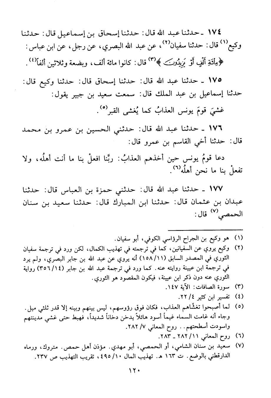 174 - حَدَّثَنَا عَبْدُ اللَّهِ قَالَ: حَدَّثَنَا إِسْحَاقُ بْنُ إِسْمَاعِيلَ، قَالَ: حَدَّثَنَا وَكِيعٌ، قَالَ: حَدَّثَنَا سُفْيَانُ، عَنْ عَبْدِ اللَّهِ الْبَصْرِيِّ، عَنْ رَجُلٍ، عَنِ ابْنِ عَبَّاسٍ،: {§مِائَةِ أَلْفٍ أَوْ يَزِيدُونَ} ، قَالَ: «كَانُوا مِائَةَ أَلْفٍ وَبِضْعَةً وَثَلَاثِينَ أَلْفًا»
