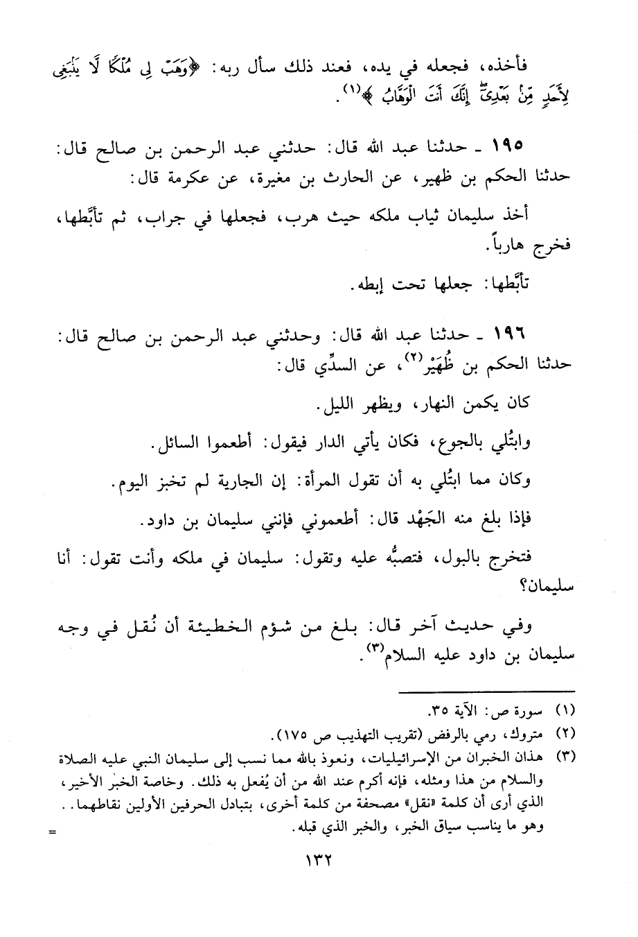 196 - حَدَّثَنَا عَبْدُ اللَّهِ قَالَ: وَحَدَّثَنِي عَبْدُ الرَّحْمَنِ بْنُ صَالِحٍ، قَالَ: حَدَّثَنَا الْحَكَمُ بْنُ ظُهَيْرٍ، عَنِ السُّدِّيِّ، قَالَ: " كَانَ يَكْمُنُ النَّهَارَ، وَيَظْهَرُ اللَّيْلَ، وَابْتُلِيَ بِالْجُوعِ، فَكَانَ يَأْتِي الدَّارَ فَيَقُولُ: أَطْعِمُوا السَّائِلَ، وَكَانَ مِمَّا ابْتُلِيَ بِهِ أَنْ تَقُولَ الْمَرْأَةُ: إِنَّ الْجَارِيَةَ لَمْ تَخْبِزِ الْيَوْمَ، فَإِذَا بَلَغَ مِنْهُ الْجَهْدُ قَالَ: §أَطْعِمُونِي فَإِنَّنِي سُلَيْمَانُ بْنُ دَاوُدَ، فَتَخْرُجُ بِالْبَوْلِ فَتَصُبُّهُ عَلَيْهِ وَتَقُولُ: سُلَيْمَانُ فِي مُلْكِهِ وَأَنْتَ تَقُولُ: أَنَا سُلَيْمَانُ وَفِي حَدِيثٍ آخَرَ قَالَ: بَلَغَ مِنْ شُؤْمِ الْخَطِيئَةِ أَنْ تُفِلَ فِي وَجْهِ سُلَيْمَانَ بْنِ دَاوُدَ عَلَيْهِ السَّلَامُ