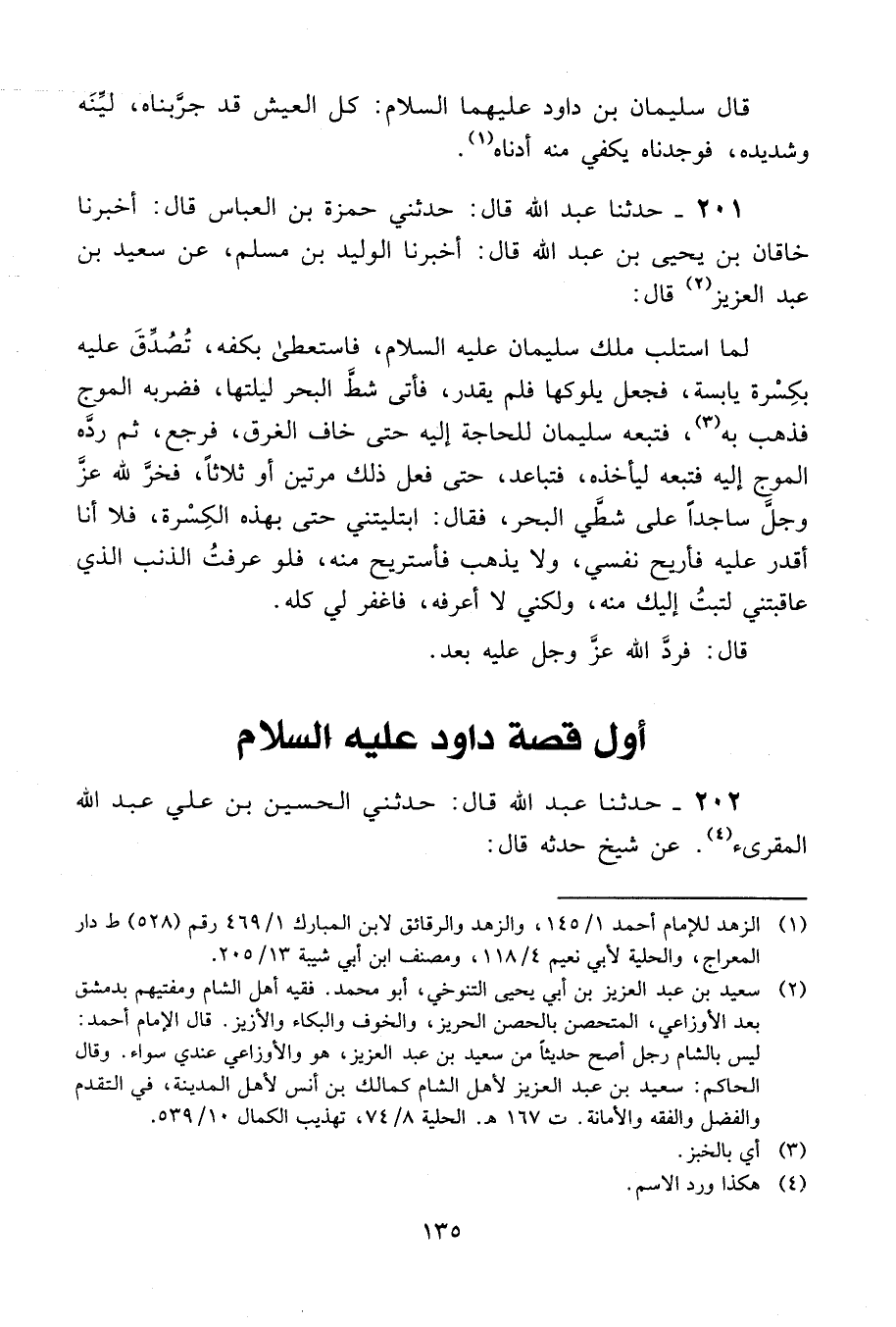 201 - حَدَّثَنَا عَبْدُ اللَّهِ قَالَ: حَدَّثَنِي حَمْزَةُ بْنُ الْعَبَّاسِ، قَالَ: أَخْبَرَنَا خَاقَانُ بْنُ يَحْيَى بْنِ عَبْدِ اللَّهِ، قَالَ: أَخْبَرَنَا الْوَلِيدُ بْنُ مُسْلِمٍ، عَنْ سَعِيدِ بْنِ عَبْدِ الْعَزِيزِ، قَالَ: " §لَمَّا اسْتُلِبَ مُلْكُ سُلَيْمَانَ عَلَيْهِ السَّلَامُ، فَاسْتَعْطَى بِكَفِّهِ، تُصُدِّقَ عَلَيْهِ بِكَسْرَةٍ يَابِسَةٍ، فَجَعَلَ يَلُوكُهَا فَلَمْ يَقْدِرْ، فَأَتَى شَطَّ الْبَحْرِ لِيَلُتَّهَا، فَضَرَبَهُ الْمَوْجُ فَذَهَبَ بِهِ، فَتَبِعَهُ سُلَيْمَانُ لِلْحَاجَةِ إِلَيْهِ حَتَّى خَافَ الْغَرَقَ، فَرَجَعَ، ثُمَّ رَدَّهُ الْمَوْجُ إِلَيْهِ فَتَبِعَهُ لِيَأْخُذَهُ فَتَبَاعَدَ، حَتَّى فَعَلَ ذَلِكَ مَرَّتَيْنِ أَوْ ثَلَاثًا، فَخَرَّ لِلَّهِ عَزَّ وَجَلَّ سَاجِدًا عَلَى شَاطِئِ الْبَحْرِ، فَقَالَ: ابْتَلَيْتَنِي حَتَّى بِهَذِهِ الْكَسْرَةِ، فَلَا أَنَا أَقْدِرُ عَلَيْهِ فَأُرِيحَ نَفْسِي، وَلَا يَذْهَبُ فَأَسْتَرِيحَ مِنْهُ، فَلَوْ عَرَفْتُ الذَّنْبَ الَّذِي عَاقَبْتَنِي لَتُبْتُ إِلَيْكَ مِنْهُ، وَلَكِنِّي لَا أَعْرِفُهُ، فَاغْفِرْ لِي كُلَّهُ. قَالَ: فَرَدَّ اللَّهُ عَزَّ وَجَلَّ عَلَيْهِ بَعْدُ "