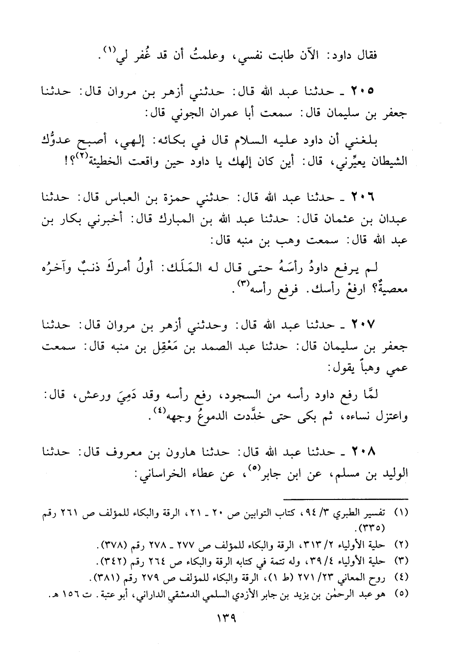 205 - حَدَّثَنَا عَبْدُ اللَّهِ قَالَ: حَدَّثَنِي أَزْهَرُ بْنُ مَرْوَانَ، قَالَ: حَدَّثَنَا جَعْفَرُ بْنُ سُلَيْمَانَ، قَالَ: سَمِعْتُ أَبَا عِمْرَانَ الْجَوْنِيَّ، قَالَ: " بَلَغَنِي أَنَّ دَاوُدَ، عَلَيْهِ السَّلَامُ قَالَ فِي بُكَائِهِ: إِلَهِي، أَصْبَحَ عَدُوُّكَ الشَّيْطَانُ يُعَيِّرُنِي قَالَ: §أَيْنَ كَانَ إِلَهُكَ يَا دَاوُدُ حِينَ وَاقَعْتَ الْخَطِيئَةَ؟ "