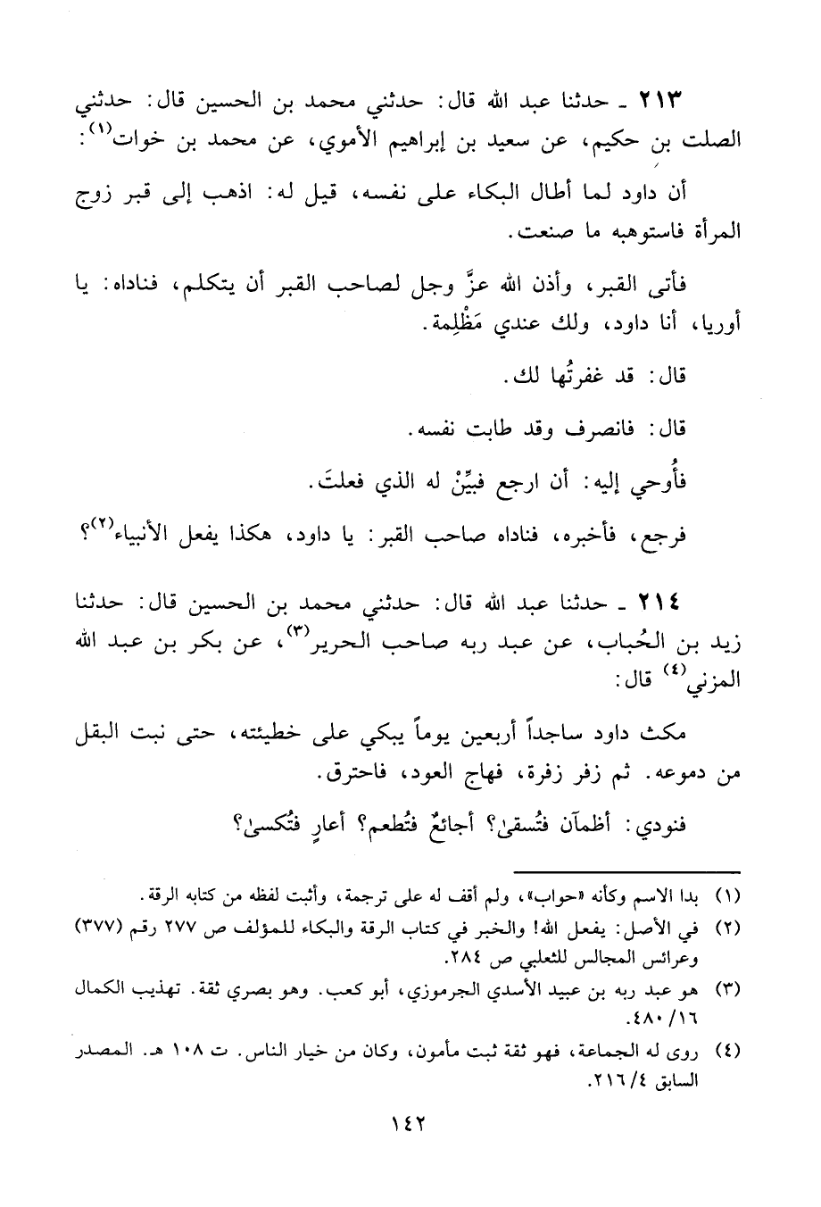 213 - حَدَّثَنَا عَبْدُ اللَّهِ قَالَ: حَدَّثَنِي مُحَمَّدُ بْنُ الْحُسَيْنِ، قَالَ: حَدَّثَنِي الصَّلْتُ بْنُ حَكِيمٍ، عَنْ سَعِيدِ بْنِ إِبْرَاهِيمَ الْأُمَوِيِّ، عَنْ مُحَمَّدِ بْنِ خَوَّاتٍ، " §أَنَّ دَاوُدَ، لَمَّا أَطَالَ الْبُكَاءُ عَلَى نَفْسِهِ، قِيلَ لَهُ: اذْهَبْ إِلَى قَبْرِ زَوْجِ الْمَرْأَةِ فَاسْتَوْهِبْهُ مَا صَنَعْتَ. فَأَتَى الْقَبْرَ، وَأَذِنَ اللَّهُ عَزَّ وَجَلَّ لِصَاحِبِ الْقَبْرِ أَنْ يَتَكَلَّمَ، فَنَادَاهُ: يَا أُورِيَا، أَنَا دَاوُدُ، وَلَكَ عِنْدِي مَظْلَمَةٌ، قَالَ: قَدْ غَفَرْتُهَا لَكَ. قَالَ: فَانْصَرَفَ وَقَدْ طَابَتْ نَفْسُهُ، فَأُوحِيَ إِلَيْهِ: أَنِ ارْجِعْ فَبَيِّنْ لَهُ الَّذِي فَعَلْتَ، فَرَجَعَ فَأَخْبَرَهُ، فَنَادَاهُ صَاحِبُ الْقَبْرِ: يَا دَاوُدُ، هَكَذَا يَفْعَلُ الْأَنْبِيَاءُ؟