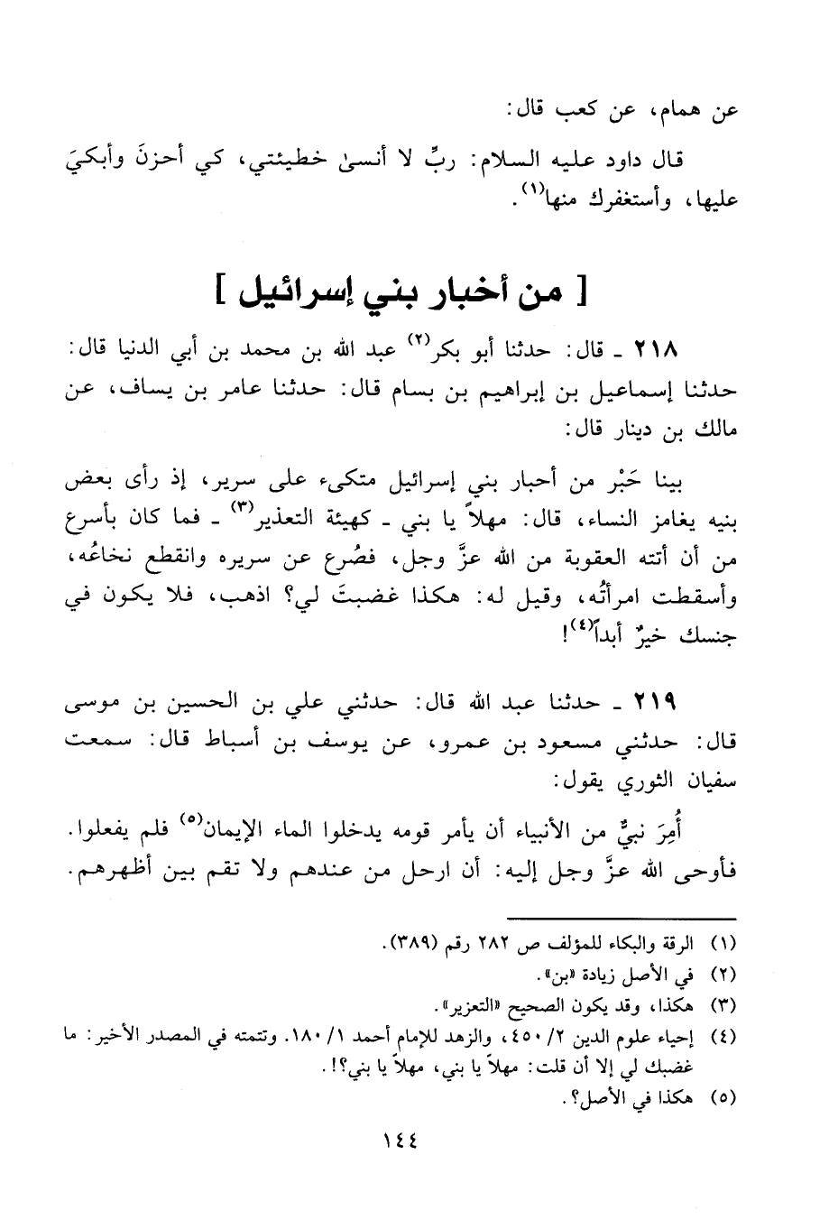 218 - قَالَ: حَدَّثَنَا أَبُو بَكْرٍ عَبْدُ اللَّهِ بْنُ مُحَمَّدِ بْنِ أَبِي الدُّنْيَا قَالَ: حَدَّثَنَا إِسْمَاعِيلُ بْنُ إِبْرَاهِيمَ بْنِ بَسَّامٍ، قَالَ: حَدَّثَنَا عَامِرُ بْنُ يَسَافٍ، عَنْ مَالِكِ بْنِ دِينَارٍ، قَالَ: " بَيْنَا حَبْرٌ مِنْ أَحْبَارِ بَنِي إِسْرَائِيلَ مُتَّكِئٌ عَلَى سَرِيرٍ، إِذْ رَأَى بَعْضَ بَنِيهِ يُغَامِزُ النِّسَاءَ، قَالَ: مَهْلًا يَا بُنَيَّ، كَهَيْئَةِ التَّعْذِيرِ. فَمَا كَانَ بِأَسْرَعَ مِنْ أَنْ أَتَتْهُ الْعُقُوبَةُ مِنَ اللَّهِ عَزَّ وَجَلَّ، فَصُرِعَ عَنْ سَرِيرِهِ وَانْقَطَعَ نُخَاعُهُ، وَأُسْقِطَتِ امْرَأَتُهُ، وَقِيلَ لَهُ: §هَكَذَا غَضِبْتَ لِي؟ اذْهَبْ، فَلَا يَكُونُ فِي جِنْسِكَ خَيْرٌ أَبَدًا "