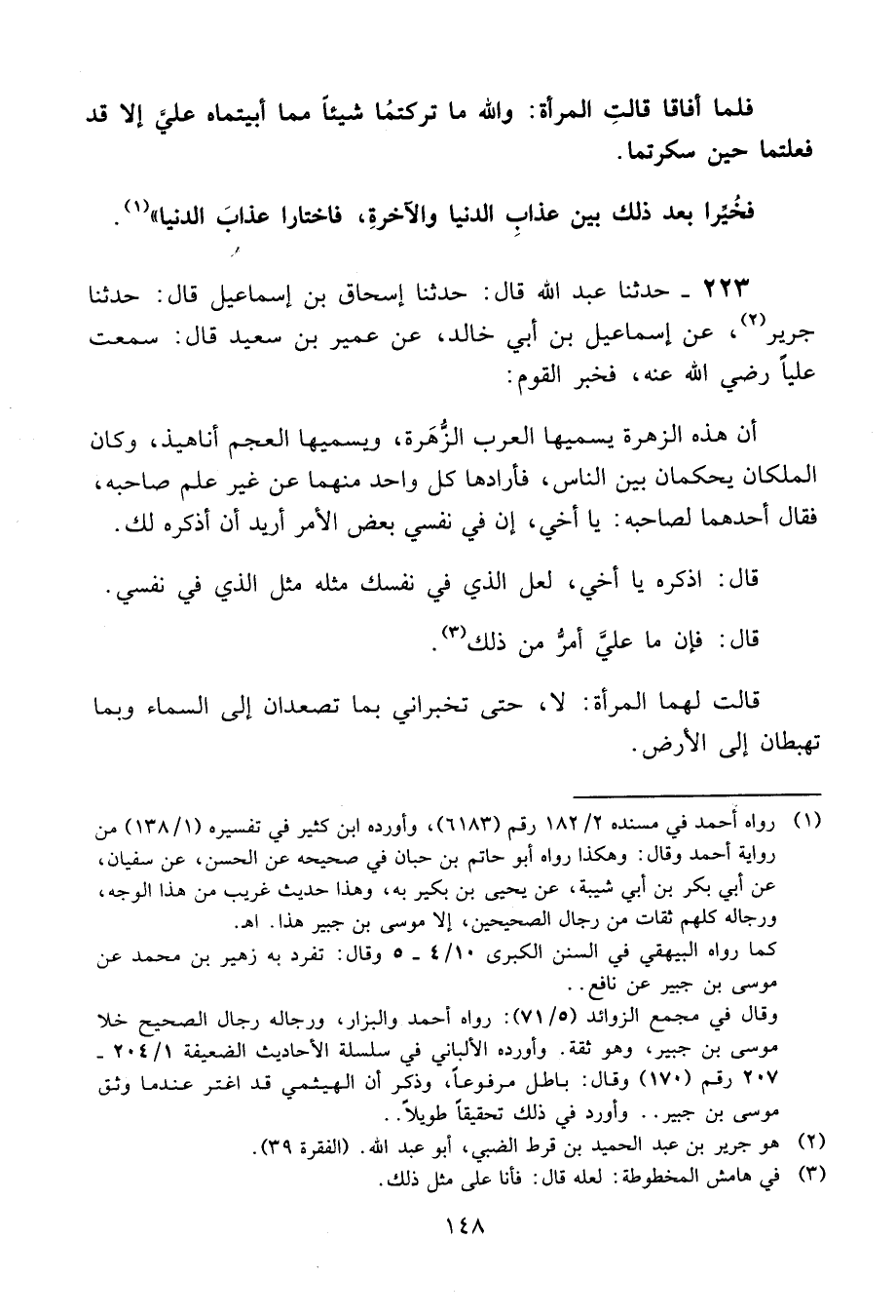 223 - حَدَّثَنَا عَبْدُ اللَّهِ قَالَ: حَدَّثَنَا إِسْحَاقُ بْنُ إِسْمَاعِيلَ، قَالَ: حَدَّثَنَا جَرِيرٌ، عَنْ إِسْمَاعِيلَ بْنِ أَبِي خَالِدٍ، عَنْ عُمَيْرِ بْنِ سَعِيدٍ، قَالَ: سَمِعْتُ عَلِيًّا، رَضِيَ اللَّهُ عَنْهُ، " فَخَبَّرَ الْقَوْمَ أَنَّ هَذِهِ الزُّهَرَةَ يُسَمِّيهَا الْعَرَبُ الزُّهَرَةَ، وَيُسَمِّيهَا الْعَجَمُ أَنَاهِيذَ، وَكَانَ الْمَلَكَانِ يَحْكُمَانِ بَيْنَ النَّاسِ، فَأَرَادَهَا كُلُّ وَاحِدٍ مِنْهُمَا عَنْ غَيْرِ عِلْمِ صَاحِبِهِ، فَقَالَ أَحَدُهُمَا لِصَاحِبِهِ: يَا أَخِي، إِنَّ فِي نَفْسِي بَعْضَ الْأَمْرِ أُرِيدُ أَنْ أَذْكُرَهُ لَكَ، قَالَ: اذْكُرْهُ يَا أَخِي، لَعَلَّ الَّذِي فِي نَفْسِكَ مِثْلُهُ مِثْلُ الَّذِي فِي نَفْسِي، قَالَ: فَإِنَّ مَا عَلَيَّ أَمَرُّ مِنْ ذَلِكَ، قَالَتْ لَهُمَا الْمَرْأَةُ: §لَا، حَتَّى تُخْبِرَانِي بِمَا تَصْعَدَانِ إِلَى السَّمَاءِ وَبِمَا تَهْبِطَانِ إِلَى الْأَرْضِ، -[149]- قَالَا: بِاسْمِ اللَّهِ الْعَظِيمِ نَهْبِطُ، وَبِهِ نَصْعَدُ، قَالَتْ: مَا أَنَا بِمُؤَاتِيَتِكُمَا الَّذِي تُرِيدَانِ حَتَّى تُعَلِّمَانِيهِ، فَقَالَ أَحَدُهُمَا: عَلِّمْهَا إِيَّاهُ، قَالَ لَهُ: فَكَيْفَ أَنَا بِشِدَّةِ عَذَابِ اللَّهِ عَزَّ وَجَلَّ؟ قَالَ الْآخَرُ: إِنَّا لَنَرْجُو سَعَةَ رَحْمَةِ اللَّهِ. فَعَلَّمَهَا إِيَّاهُ، فَتَكَلَّمَتْ، فَطَارَتْ إِلَى السَّمَاءِ، فَفَزِعَ لَهَا مَلَكٌ فِي السَّمَاءِ صُعُودَهَا، فَطَأْطَأَ رَأْسَهُ، فَلَمْ يَجْلِسْ بَعْدُ قَالَ: سُبْحَانَ اللَّهِ عَزَّ وَجَلَّ، فَكَانَتْ كَوْكَبًا "