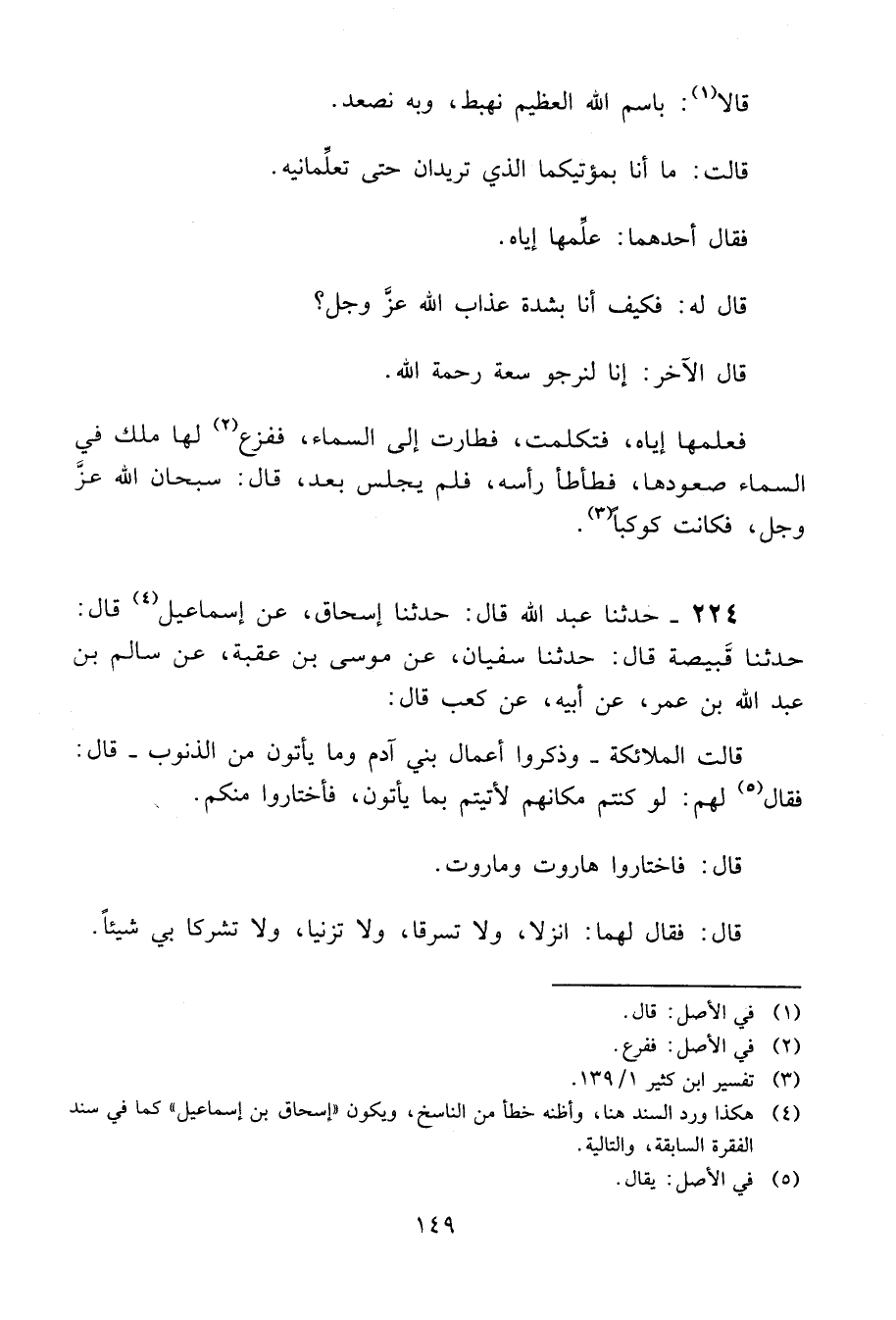 224 - حَدَّثَنَا عَبْدُ اللَّهِ قَالَ: حَدَّثَنَا إِسْحَاقُ، عَنْ إِسْمَاعِيلَ، قَالَ: حَدَّثَنَا قَبِيصَةُ، قَالَ: حَدَّثَنَا سُفْيَانُ، عَنْ مُوسَى بْنِ عُقْبَةَ، عَنْ سَالِمِ بْنِ عَبْدِ اللَّهِ بْنِ عُمَرَ، عَنْ أَبِيهِ، عَنْ كَعْبٍ، قَالَ: " قَالَتِ الْمَلَائِكَةُ، وَذَكَرُوا أَعْمَالَ بَنِي آدَمَ وَمَا يَأْتُونَ مِنَ الذُّنُوبِ، قَالَ: فَقَالَ لَهُمْ: لَوْ كُنْتُمْ مَكَانَهُمْ لَأَتَيْتُمْ بِمَا يَأْتُونَ، فَاخْتَارُوا مِنْكُمْ. قَالَ: §فَاخْتَارُوا هَارُوتَ وَمَارُوتَ، قَالَ: فَقَالَ لَهُمَا: انْزِلَا، وَلَا تَسْرِقَا، وَلَا تَزْنِيَا، وَلَا تُشْرِكَا بِي شَيْئًا، -[150]- قَالَ: فَنَزَلَا. قَالَ ابْنُ عُمَرَ: فَقَالَ كَعْبٌ: فَوَاللَّهِ مَا أَمْسَيَا حَتَّى أَتَيَا مَا حَرَّمَ اللَّهُ عَزَّ وَجَلَّ عَلَيْهِمَا "