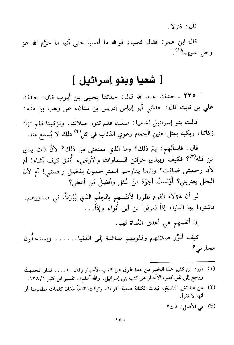 225 - حَدَّثَنَا عَبْدُ اللَّهِ قَالَ: حَدَّثَنَا يَحْيَى بْنُ أَيُّوبَ، قَالَ: حَدَّثَنَا عَلِيُّ بْنُ ثَابِتٍ، قَالَ: حَدَّثَنِي أَبُو إِلْيَاسَ إِدْرِيسُ بْنُ سِنَانٍ، عَنْ وَهْبِ بْنِ مُنَبِّهٍ،: " §قَالَتْ بَنُو إِسْرَائِيلَ لِشَعْيَا: صَلَّيْنَا فَلَمْ تُنَوَّرْ صَلَاتُنَا، وَتَزَكَّيْنَا فَلَمْ تُزَكَّ زَكَاتُنَا، وَبَكَيْنَا بِمِثْلِ حَنِينِ الْحَمَامِ وَعَوِيِّ الذِّئَابِ فِي كُلِّ ذَلِكَ لَا يُسْمَعُ مِنَّا. قَالَ: فَاسْأَلْهُمْ: بِمَ ذَلِكَ؟ وَمَا الَّذِي يَمْنَعُنِي مِنْ ذَلِكَ؟ لِأَنَّ ذَاتَ يَدِي مِنْ قِلَّةٍ؟ فَكَيْفَ وَبِيَدِي خَزَائِنُ السَّمَاوَاتِ وَالْأَرْضِ، أُنْفِقُ كَيْفَ أَشَاءُ؟ أَمْ لِأَنَّ رَحْمَتِي ضَاقَتْ؟ وَإِنَّمَا يَتَرَاحَمُ الْمُتَرَاحِمُونَ بِفَضْلِ رَحْمَتِي، أَمْ لِأَنَّ الْبُخْلَ يَعْتَرِينِي؟ أَوَلَسْتُ أَجْوَدَ مَنْ سُئِلَ، وَأَفْضَلَ مَنْ أَعْطَى؟ لَوْ أَنْ هَؤُلَاءِ الْقَوْمَ نَظَرُوا لِأَنْفُسِهِمْ بِالْحِلْمِ الَّذِي يُورَثُ فِي صُدُورِهِمْ، فَاشْتَرَوْا بِهَا الدُّنْيَا، إِذًا لَعَرَفُوا مِنْ أَيْنَ أُتُوا، وَإِذًا. . . . إِنَّ أَنْفُسَهُمْ هِيَ أَعْدَى الْعُدَاةِ لَهُمْ. كَيْفَ أُنَوِّرَ صَلَاتَهُمْ وَقُلُوبُهُمْ صَاغِيَةٌ إِلَى الدُّنْيَا. . . وَيَسْتَحِلُّونَ مَحَارِمِي؟ -[151]- أَمْ كَيْفَ أَقْبَلُ صِيَامَهُمْ وَهُمْ يَتَقوَّوْنَ عَلَيْهِ بِالطُّعْمَةِ الْحَرَامِ؟ أَظُنُّهُ قَالَ: أَمْ كَيْفَ أَقْبَلُ زَكَاتَهُمْ وَإِنَّمَا اغْتَصَبُوا النَّاسَ؟ وَبِمَ أُؤْجِرُ عَلَيْهَا أَهْلَهَا الْمُغْتَصِبِينَ؟ فَإِنِّي قَضَيْتُ عَلَى نَفْسِي قَضَاءً يَوْمَ خَلَقْتُ السَّمَاوَاتِ وَالْأَرْضَ جَعَلْتُ لِذَلِكَ أَجَلًا مُؤجَّلًا لَابُدَّ وَأَنْ سَوْفَ يَقَعُ، فَاسْأَلْهُمْ مَتَى ذَلِكَ؟ وَمَنِ الْعَالِمُ بِهَذَا الْأَمْرِ مِنْ أَعْوَانِ هَذَا الْأَمْرِ إِنْ كَانُوا صَادِقِينَ؟ فَإِنِّي مُبْعِثٌ لِذَلِكَ نَبِيًّا أُمِّيًّا، لَيْسَ بِفَظٍّ وَلَا غَلِيظٍ، وَلَا صَخَّابٍ بِالْأَسْوَاق، وَلَا مُتَزَيِّنٍ بِالْفُحْشِ، وَلَا قَوَّالٍ للْخَنَا أُسَدِّدُهُ لِكُلِّ جَمِيلٍ، وَأَهَبُ لَهُ كُلَّ خُلُقٍ كَرِيمٍ، ثُمَّ أَجْعَلُ التَّقْوَى ضَمِيرَهَ، وَالْحِكْمَةَ مَعْقُولَهُ، وَالْبِرَّ وَالْوَفَاءَ طَبِيعَتَهُ، وَأَجْعَلُ أُمَّتَهُ خَيْرَ أُمَّةٍ أُخْرِجَتْ لِلنَّاسِ، تَأْمُرُ بِالْمَعْرُوفِ، وَتَنْهَى عَنِ الْمُنْكَرِ، إِيمَانًا بِي وَإِخْلَاصًا، يُصَلُّونَ لِي عَلَى الْأَشْرَافِ، يُطَهِّرُونَ الْأَطْرَافَ، أَنَاجِيلُهُمْ صُدُورُهُمْ، وَقُرْبَانُهُمْ دِمَاؤُهُمْ، لُيُوثُ النَّهَارِ، رُهْبَانُ اللَّيْلِ، ذَلِكَ فَضْلِي أُؤْتِيهِ مَنْ أَشَاءُ، وَأَنَا ذُو الْفَضْلِ الْعَظِيمِ "