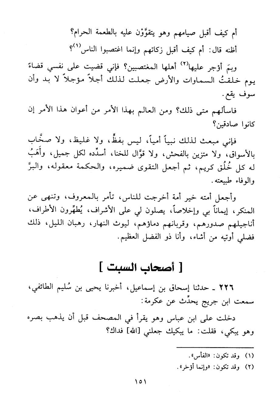 226 - حَدَّثَنَا عَبْدُ اللَّهِ قَالَ: حَدَّثَنَا إِسْحَاقُ بْنُ إِسْمَاعِيلَ، أَخْبَرَنَا يَحْيَى بْنُ سُلَيْمٍ الطَّائِفِيُّ، سَمِعْتُ ابْنَ جُرَيْجٍ، يُحَدِّثُ، عَنْ عِكْرِمَةَ: دَخَلْتُ عَلَى ابْنِ عَبَّاسٍ وَهُوَ يَقْرَأُ فِي الْمُصْحَفِ قَبْلَ أَنْ يَذْهَبَ بَصَرُهُ وَهُوَ يَبْكِي، فَقُلْتُ: مَا يُبْكِيكَ، جَعَلَنِي اللَّهُ فِدَاكَ؟ قَالَ: " وَيْحَكَ هَلْ تَعْرِفُ أَيْلَةَ؟ قُلْتُ: §وَمَا أَيْلَةُ؟ قَالَ: قَرْيَةٌ كَانَ بِهَا نَاسٌ مِنَ الْيَهُودِ، حَرَّمَ اللَّهُ تَعَالَى عَلَيْهِمْ حِيتَانَهُمْ يَوْمَ سَبْتِهِمْ، وَكَانَتْ حِيتَانُهُمْ تَأْتِيهِمْ يَوْمَ السَّبْتِ بِيضًا سِمَانًا كَأَمْثَالِ الْمَخَاضِ يَنْطَحُ بِأَبْنِيَتِهِمْ، فَإِذَا كَانَ غَيْرُ يَوْمِ السَّبْتِ ذَهَبَتْ فَلَمْ يَجِدُوهَا، وَلَمْ يُدْرِكُوهَا إِلَّا فِي كَبَدٍ وَمَشَقَّةٍ وَمُؤْنَةٍ شَدِيدَةٍ، فَقَالَ بَعْضُهُمْ لِبَعْضٍ: لَعَلَّنَا لَوِ اصْطَدْنَاهَا يَوْمَ السَّبْتِ لَأَكَلْنَاهَا فِي غَيْرِ يَوْمِ السَّبْتِ، فَأَخَذَهَا أَهْلُ بَيْتٍ مِنْهُمْ، فَشَوَوْا، فَوَجَدَ جِيرَانُهُمْ رِيحَ الشِّوَاءِ، فَقَالُوا: وَاللَّهِ مَا نَرَاهُ أَصَابَ بَنِي فُلَانٍ شَيْءٌ، فَأَخَذَهَا غَيْرُهُمْ، حَتَّى كَثُرَ ذَلِكَ فِيهِمْ وَفَشَا، فَافْتَرَقُوا ثَلَاثَ فِرَقٍ: فِرْقَةٌ أَكَلَتْ، وَفِرْقَةٌ نَهَتْ، وَفِرْقَةٌ قَالُوا: {لِمَ تَعِظُونَ قَوْمًا اللَّهُ مُهْلِكُهُمْ أَوْ مُعَذِّبُهُمْ عَذَابًا شَدِيدًا قَالُوا مَعْذِرَةً إِلَى رَبِّكُمْ وَلَعَلَّهُمْ يَتَّقُونَ} [الأعراف: 164] . فَقَالَتِ الْفِرْقَةُ الَّتِي نَهَتْ: يَا قَوْمُ، إِنَّا نُحَذِّرُكُمْ أَنْ يُمِيتَكُمُ اللَّهُ بِمَسْخٍ أَوْ خَسْفٍ أَوْ قَذْفٍ، أَوْ بَعْضِ مَا عِنْدَهُ مِنَ الْعَذَابِ، وَاللَّهِ لَا نُبَايِتُكُمْ مَكَانًا أَنْتُمْ فِيهِ. فَخَرَجُوا مِنَ السُّورِ، -[153]- فَلَمَّا كَانَ مِنَ الْغَدِ أَتَوُا السُّورَ، ثُمَّ رَقِيَ مِنْهُمْ رَاقٍ فَقَالَ: يَا عِبَادَ اللَّهِ، قِرَدَةٌ وَاللَّهِ لَهَا أَذْنَابٌ تَعَاوي. فَنَزَلَ، فَفَتَحَ الْبَابَ، فَدَخَلَ عَلَيْهِمُ النَّاسُ، فَعَرَفَتِ الْقِرَدَةُ أَنْسَابَهَا مِنَ الْإِنْسِ، وَلَمْ تَعْرِفْ أَنْسَابَهَا مِنَ الْقِرَدَةِ، فَيَأْتِي الْقِرْدُ الْإِنْسَانَ فَيَقُولُ لَهُ: أَنْتَ فُلَانٌ؟ فَيُشِيرُ بِرَأْسِهِ: نَعَمْ، وَيَبْكِي. وَتَجِيءُ الْقِرَدَةُ إِلَى الْإِنْسَانِ فَتَقُولُ: أَنْتِ فُلَانَةُ؟ فَتُشِيرُ بِرَأْسِهَا: نَعَمْ، وَتَبْكِي. فَقَالُوا لَهُمْ: إِنَّا قَدْ حَذَّرْنَاكُمْ عِقَابَ اللَّهِ عَزَّ وَجَلَّ قَالَ ابْنُ عَبَّاسٍ: وَاسْمَعِ اللَّهَ تَعَالَى يَقُولُ: {أَنْجَيْنَا الَّذِينَ يَنْهَوْنَ عَنِ السُّوءِ وَأَخَذْنَا الَّذِينَ ظَلَمُوا بِعَذَابٍ بَئِيسٍ بِمَا كَانُوا يَفْسُقُونَ} [الأعراف: 165] ، فَمَا أَدْرِي مَا فَعَلَتِ الْفِرْقَةُ الثَّالِثَةُ، فَكَمْ مِنْ مُنْكَرٍ قَدْ رَأَيْنَا فَلَمْ نَنْهَ عَنْهُ. فَمِنْ هَذَا بَكَى ابْنُ عَبَّاسٍ، قَالَ عِكْرِمَةُ: فَقُلْتُ لَهُ: أَلَا تَرَى، جَعَلَنِي اللَّهُ فِدَاكَ، -[152]- أَنَّهُمْ قَدْ أَنْكَرُوا وَعَرَفُوا حَتَّى قَالُوا: {لِمَ تَعِظُونَ قَوْمًا اللَّهُ مُهْلِكُهُمْ أَوْ مُعَذِّبُهُمْ عَذَابًا شَدِيدًا} [الأعراف: 164] ، قَالَ: فَأَعْجَبَهُ قَوْلِي، وَأَمَرَ لِي بِبُرْدٍ "