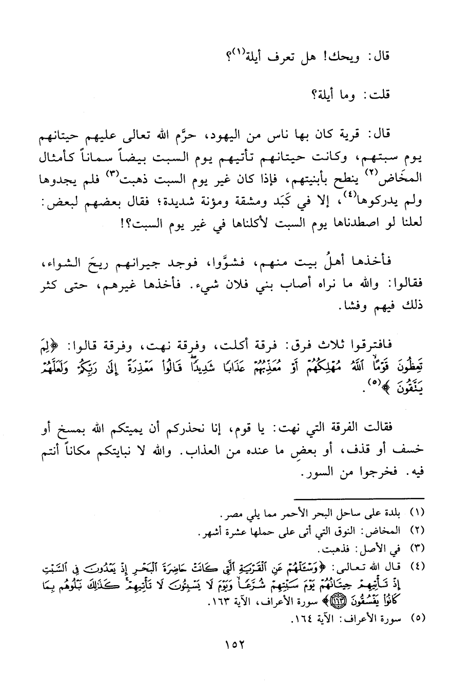 227 - حَدَّثَنَا عَبْدُ اللَّهِ: حَدَّثَنَا إِسْحَاقُ بْنُ إِسْمَاعِيلَ، حَدَّثَنَا جَرِيرٌ، عَنْ عَطَاءِ بْنِ السَّائِبِ،: -[154]- " كُنْتُ جَالِسًا فِي الْمَسْجِدِ، فَإِذَا شَيْخٌ قَدْ جَاءَ فَجَلَسَ وَجَلَسَ إِلَيْهِ النَّاسُ، فَقَالُوا: هَذَا مِنْ أَصْحَابِ عَبْدِ اللَّهِ، فَقَالَ: سَمِعْتُ عَبْدَ اللَّهِ فِي قَوْلِهِ عَزَّ وَجَلَّ: {وَاسْأَلْهُمْ عَنِ الْقَرْيَةِ الَّتِي كَانَتْ حَاضِرَةَ الْبَحْرِ} [الأعراف: 163] إِلَى نِهَايَةِ {كَانُوا يَفْسُقُونَ} [العنكبوت: 34] ، قَالَ: لَمَّا حَرَّمَ اللَّهُ عَزَّ وَجَلَّ عَلَيْهِمُ السَّبْتَ، كَانَتِ الْحِيتَانُ تَأْمَنُ يَوْمَ السَّبْتِ فَتَجِيءُ، لَا يَسْتَطِيعُونَ أَنْ يَمَسُّوهَا، فَكَانَ إِذَا ذَهَبَ يَوْمُ السَّبْتِ ذَهَبَتْ، فَكَانُوا يَتَصيَّدُونَ كَمَا يَتَصيَّدُ النَّاسُ، فَلَمَّا أَرَادُوا أَنْ يَعْتَدُوا فِي السَّبْتِ اصْطَادُوا فِيهِ، فَنَهَاهُمْ قَوْمٌ مِنْ صُلَحَائِهِمْ، فَأَبَوْا وَكَاثَرَهُمُ الْفُجَّارُ، فَأَرَادَ الْفُجَّارُ قِتَالَهُمْ، وَكَانَ فِيهِمْ مَنْ لَا يَشْتَهُونَ قَتْلَهُمْ، أَبُو أَحَدِهِمْ أَوْ أَخُوهُ أَوْ ذُو قَرَابَتِهِ. فَلَمَّا نَهَوْهُمْ أَبَوْا، قَالَ الصَّالِحُونَ: إِذَا أَبَيْتُمْ فَإِنَّا نَجْعَلُ بَيْنَنَا وَبَيْنَكُمْ حَائِطًا، قَالَ: فَفَعَلُوا، فَلَمَّا فَقَدُوا أَصْوَاتَهُمْ قَالَ بَعْضُهُمْ لِبَعْضٍ: لَوْ نَظَرْتُمْ إِلَى إِخْوَانِكُمْ مَا فَعَلُوا؟ فَنَظَرُوا، §فَإِذَا هُمْ قَدْ مُسِخُوا قُرُودًا، فَكَانُوا يَعْرِفُونَ الْكَبِيرَ بِكِبَرِهِ، وَالصَّغِيرَ بِصِغَرِهِ، فَجَعَلُوا يَبْكُونَ إِلَيْهِمْ. هَذَا بَعْدَ مُوسَى صَلَّى اللَّهُ عَلَيْهِ وَسَلَّمَ "