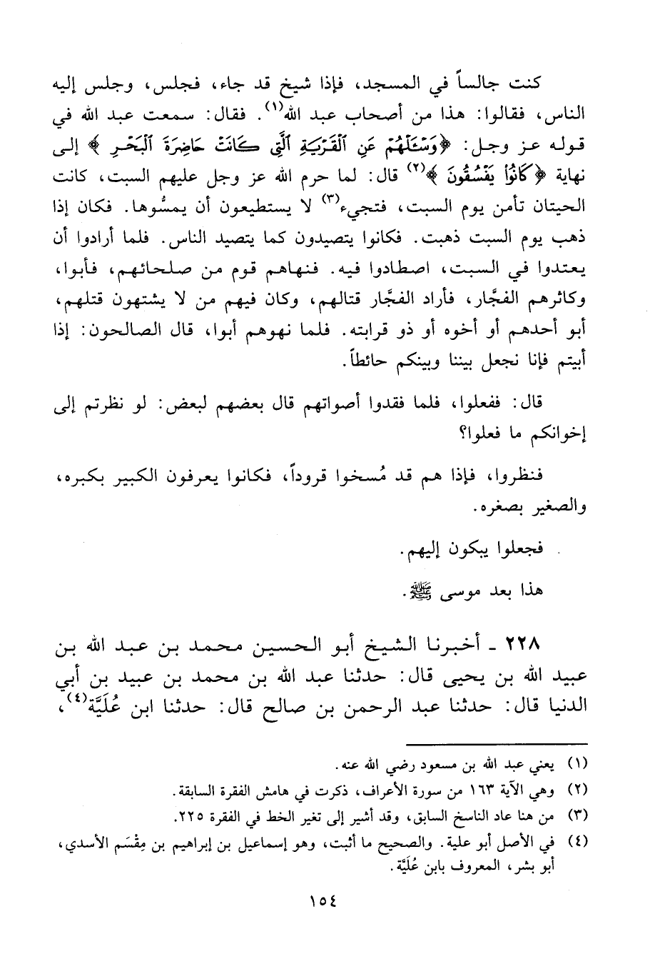 228 - أَخْبَرَنَا الشَّيْخُ أَبُو الْحُسَيْنِ مُحَمَّدُ بْنُ عَبْدِ اللَّهِ بْنِ عُبَيْدِ اللَّهِ بْنِ يَحْيَى قَالَ: حَدَّثَنَا عَبْدُ اللَّهِ بْنُ مُحَمَّدِ بْنِ عُبَيْدِ بْنِ أَبِي الدُّنْيَا، قَالَ: حَدَّثَنَا عَبْدُ الرَّحْمَنِ بْنُ صَالِحٍ، قَالَ: حَدَّثَنَا ابْنُ عُلَيَّةَ، -[155]- عَنْ أَيُّوبَ، قَالَ: " تَلَا الْحَسَنُ ذَاتَ يَوْمٍ قَوْلَهُ تَعَالَى: {وَاسْأَلْهُمْ عَنِ الْقَرْيَةِ الَّتِي كَانَتْ حَاضِرَةَ الْبَحْرِ} [الأعراف: 163] إِلَى آخِرِ الْآيَةِ، فَقَالَ: §حُوتٌ حَرَّمَهُ اللَّهُ عَلَيْهِمْ فِي يَوْمٍ، وَأَحَلَّهُ لَهُمْ فِيمَا سِوَى ذَلِكَ، فَكَانَ يَأْتِيهِمْ فِي الَّذِي حَرَّمَهُ عَلَيْهِمْ كَأَنَّهُ الْمَخَاضُ، مَا يَمْتَنِعُ مِنْ أَحَدٍ، فَجَعَلُوا يَهُمُّونَ وَيُمْسِكُونَ، وَقَلَّ مَا رَأَيْتَ أَحَدًا يُكْثِرُ الْإِهْمَامَ بِالذَّنْبِ إِلَّا وَاقَعَهُ، فَجَعَلُوا يَهُمُّونَ بِالذَّنْبِ وَيُمْسِكُونَ، وَأَشَدُّهُ عُقُوبَةً فِي الْآخِرَةِ، وَايْمُ اللَّهِ، لِلْمُؤْمِنِ أَعْظَمُ حُرْمَةً عِنْدَ اللَّهِ عَزَّ وَجَلَّ مِنْ حُوتٍ، وَلَكِنَّ اللَّهَ عَزَّ وَجَلَّ جَعَلَ مَوْعِدَهُمُ السَّاعَةَ، {وَالسَّاعَةُ أَدْهَى وَأَمَرُّ} [القمر: 46] "