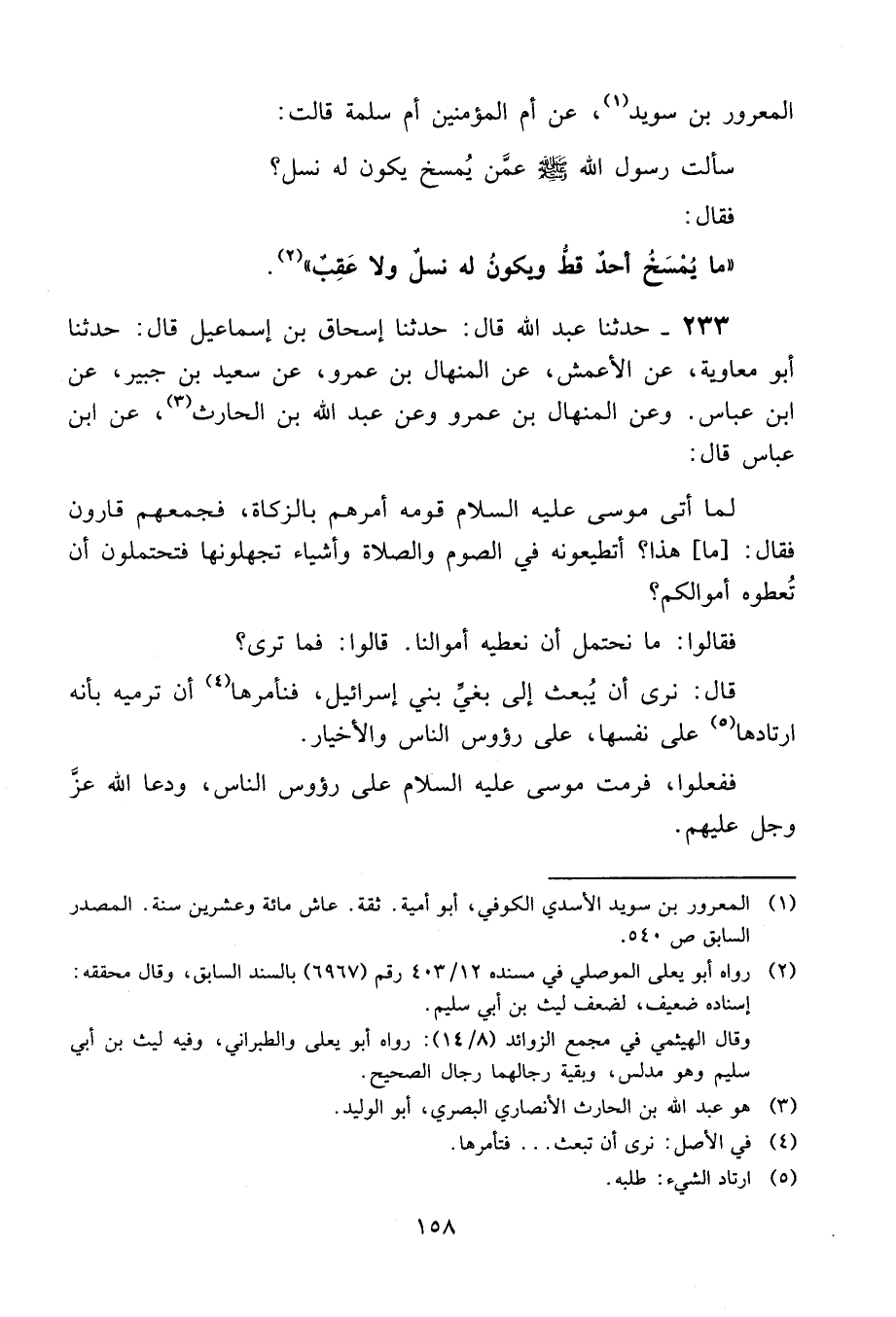 233 - حَدَّثَنَا عَبْدُ اللَّهِ قَالَ: حَدَّثَنَا إِسْحَاقُ بْنُ إِسْمَاعِيلَ، قَالَ: حَدَّثَنَا أَبُو مُعَاوِيَةَ، عَنِ الْأَعْمَشِ، عَنِ الْمِنْهَالِ بْنِ عَمْرٍو، عَنْ سَعِيدِ بْنِ جُبَيْرٍ، عَنِ ابْنِ عَبَّاسٍ، وَعَنِ الْمِنْهَالِ بْنِ عَمْرٍو، وَعَنْ عَبْدِ اللَّهِ بْنِ الْحَارِثِ، عَنِ ابْنِ عَبَّاسٍ، قَالَ: " لَمَّا أَتَى مُوسَى عَلَيْهِ السَّلَامُ قَوْمَهُ أَمَرَهُمْ بِالزَّكَاةِ، فَجَمَعَهُمْ قَارُونُ فَقَالَ: مَا هَذَا؟ أَتُطِيعُونَهُ فِي الصَّوْمِ وَالصَّلَاةِ وَأَشْيَاءَ تَجْهَلُونَهَا فَتَحْتَمِلُونَ أَنْ تُعْطُوهُ أَمْوَالَكُمْ؟ فَقَالُوا: مَا نَحْتَمِلُ أَنْ نُعْطِيَهُ أَمْوَالَنَا، قَالُوا: فَمَا تَرَى؟ قَالَ: نَرَى أَنْ يُبْعَثَ إِلَى بَغِيِّ بَنِي إِسْرَائِيلَ، فَنَأْمُرُهَا أَنْ تَرْمِيَهُ بِأَنَّهُ ارتَادَهَا عَلَى نَفْسِهَا، عَلَى رُءُوسِ النَّاسِ وَالْأَخْيَارِ. فَفَعَلُوا، فَرَمَتْ مُوسَى عَلَيْهِ السَّلَامُ عَلَى رُءُوسِ النَّاسِ، وَدَعَا اللَّهُ عَزَّ وَجَلَّ عَلَيْهِمْ، -[159]- فَأَوْحَى اللَّهُ عَزَّ وَجَلَّ إِلَى الْأَرْضِ أَنْ أَطِيعِيهِ، فَقَالَ مُوسَى لِلْأَرْضِ: خُذِيهِمْ، فَأَخَذَتْهُمْ إِلَى أَعْقَابِهِمْ، فَجَعَلُوا يَقُولُونَ: يَا مُوسَى، يَا مُوسَى، قَالَ: خُذِيهِمْ، فَأَخَذَتْهُمْ إِلَى رُكَبِهِمْ، فَجَعَلُوا يَقُولُونَ: يَا مُوسَى، يَا مُوسَى، قَالَ: خُذِيهِمْ، فَأَخَذَتْهُمْ إِلَى أَعْنَاقِهِمْ، فَجَعَلُوا يَقُولُونَ: يَا مُوسَى، يَا مُوسَى، قَالَ: خُذِيهِمْ، فَغَيَّبَتْهُمْ فِيهَا، فَأَوْحَى اللَّهُ عَزَّ وَجَلَّ: يَا مُوسَى، يَسْأَلُكَ عِبَادِي وَيَتَضرَّعُونَ إِلَيْكَ فَلَمْ تُجِبْهُمْ؟ §أَمَا وَعِزَّتِي لَوْ إِيَّايَ دَعَوْا لَأَجَبْتُهُمْ "