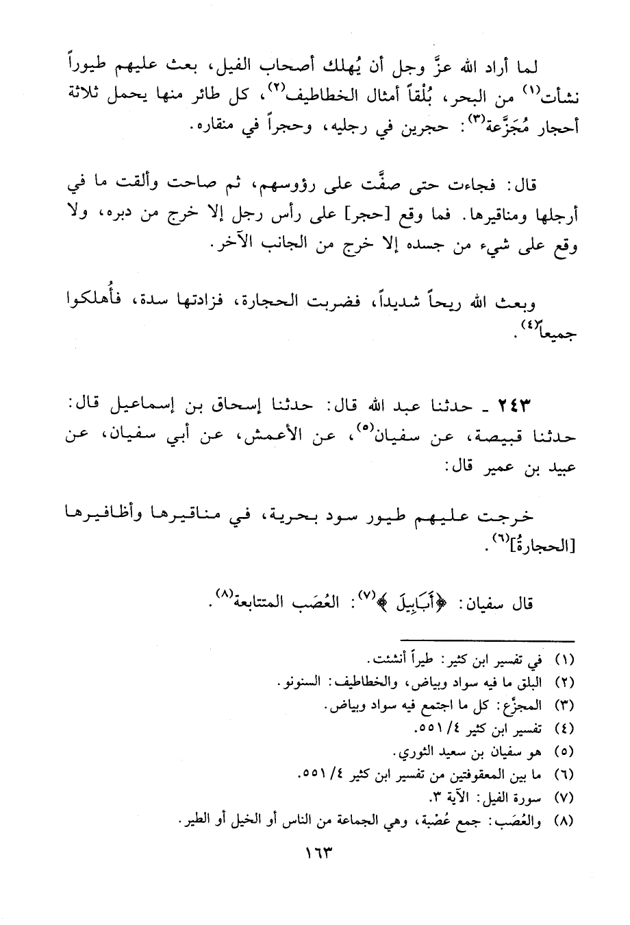 243 - حَدَّثَنَا عَبْدُ اللَّهِ قَالَ: حَدَّثَنَا إِسْحَاقُ بْنُ إِسْمَاعِيلَ، قَالَ: حَدَّثَنَا قَبِيصَةُ، عَنْ سُفْيَانَ، عَنِ الْأَعْمَشِ، عَنْ أَبِي سُفْيَانَ، عَنْ عُبَيْدِ بْنِ عُمَيْرٍ، قَالَ: «§خَرَجَتْ عَلَيْهِمْ طُيُورٌ سُودٌ بَحْرِيَّةٌ، فِي مَنَاقِيرِهَا وَأَظَافِيرِهَا الْحِجَارَةُ» قَالَ سُفْيَانُ: أَبَابِيلَ: الْعُصَبُ الْمُتَتَابِعَةُ