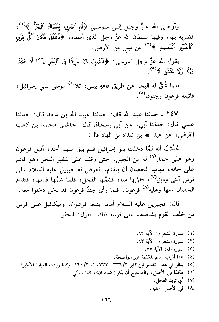 247 - حَدَّثَنَا عَبْدُ اللَّهِ قَالَ: حَدَّثَنَا عُبَيْدُ اللَّهِ بْنُ سَعْدٍ، قَالَ: حَدَّثَنَا عَمِّي، قَالَ: حَدَّثَنَا أَبِي، عَنْ أَبِي إِسْحَاقَ، قَالَ: حَدَّثَنِي مُحَمَّدُ بْنُ كَعْبٍ الْقُرَظِيُّ، عَنْ عَبْدِ اللَّهِ بْنِ شَدَّادِ بْنِ الْهَادِ، قَالَ: " حُدِّثْتُ أَنَّهُ لَمَّا دَخَلَتْ بَنُو إِسْرَائِيلَ فَلَمْ يَبْقَ مِنْهُمْ أَحَدٌ، §أَقْبَلَ فِرْعَوْنُ وَهُوَ عَلَى حِصَانٍ لَهُ مِنَ الْجَبَلِ، حَتَّى وَقَفَ عَلَى شَفِيرِ الْبَحْرِ وَهُوَ قَائِمٌ عَلَى حَالِهِ، فَهَابَ الْحِصَانُ أَنْ يَتَقَدَّمَ، فَعَرَضَ لَهُ جِبْرِيلُ عَلَيْهِ السَّلَامُ عَلَى فَرَسٍ أُنْثَى وَدِيقٍ، فَقَرَّبَهَا مِنْهُ، فَشَمَّهَا الْفَحْلُ، فَلَمَّا شَمَّهَا قَدَّمَهَا، فَتَقَدَّمَ الْحِصَانُ مَعَهَا وَعَلَيْهِ فِرْعَوْنُ. فَلَمَّا رَأَى جُنْدُ فِرْعَوْنَ قَدْ دَخَلَ دَخَلُوا مَعَهُ، قَالَ: فَجِبْرِيلُ عَلَيْهِ السَّلَامُ أَمَامَهُ يَتْبَعُهُ فِرْعَوْنُ، وَمِيكَائِيلُ عَلَى فَرَسٍ مِنْ خَلْفِ الْقَوْمِ يَشْحَذَهُمْ عَلَى فَرَسِهِ ذَلِكَ، يَقُولُ: الْحَقُوا، -[167]- حَتَّى إِذَا فَصَلَ جِبْرِيلُ عَلَيْهِ السَّلَامُ مِنَ الْبَحْرِ وَلَيْسَ مَعَهُ أَحَدٌ، وَوَقَفَ مِيكَائِيلُ عَلَى نَاحِيَتِهِ الْأُخْرَى لَيْسَ خَلْفَهُ أَحَدٌ، انْطَبَقَ عَلَيْهِمُ الْبَحْرُ، وَنَادَى فِرْعَوْنُ حِينَ رَأَى مِنْ سُلْطَانِ اللَّهِ عَزَّ وَجَلَّ وَقُدْرَتِهِ مَا رَأَى: {آمَنْتُ أَنَّهُ لَا إِلَهَ إِلَّا الَّذِي آمَنَتْ بِهِ بَنُو إِسْرَائِيلَ وَأَنَا مِنَ الْمُسْلِمِينَ} [يونس: 90] ، يَقُولُ اللَّهُ تَبَارَكَ وَتَعَالَى: {آلْآنَ وَقَدْ عَصَيْتَ قَبْلُ وَكُنْتَ مِنَ الْمُفْسِدِينَ فَالْيَوْمَ نُنَجِّيكَ بِبَدَنِكَ لِتَكُونَ لِمَنْ خَلْفَكَ آيَةً} [يونس: 92] أَيْ: عِبْرَةً وَبَيِّنَةً، أَنَّكَ لَمْ تَكُنْ كَمَا تَقُولُ لِنَفْسِكَ. فَكَانَ يُقَالُ: لَوْ لَمْ يُخْرِجْهُ اللَّهُ تَعَالَى بِبَدَنِهِ حَتَّى عَرَفُوهُ، لَشكَّ فِيهِ بَعْضُ النَّاسِ "
