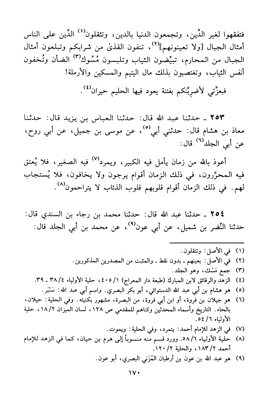 254 - حَدَّثَنَا عَبْدُ اللَّهِ قَالَ: حَدَّثَنَا مُحَمَّدُ بْنُ رَجَاءِ بْنِ السَّنَدِيِّ، قَالَ: حَدَّثَنَا النَّضْرُ بْنُ شُمَيْلٍ، عَنْ أَبِي عَوْنٍ، عَنْ مُحَمَّدِ عَنْ أَبِي الْجَلْدِ، قَالَ: -[171]- «§يَبْعَثُ عَلَى النَّاسِ مُلُوكٌ بِذِنُوبِهِمْ»
